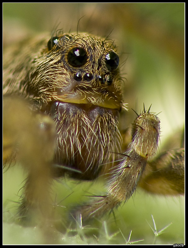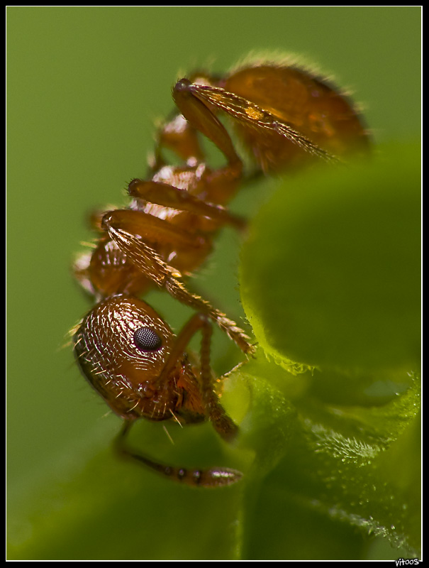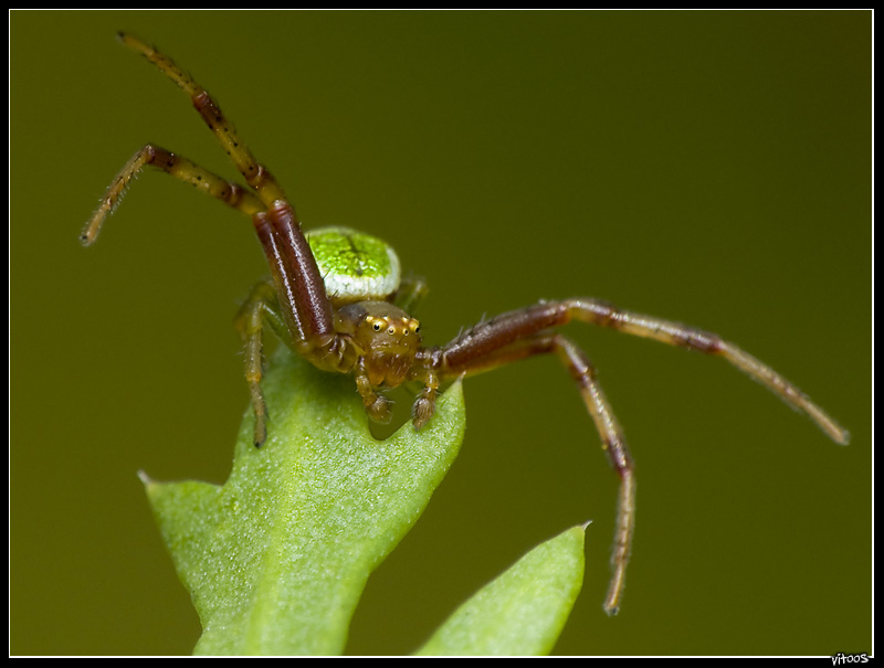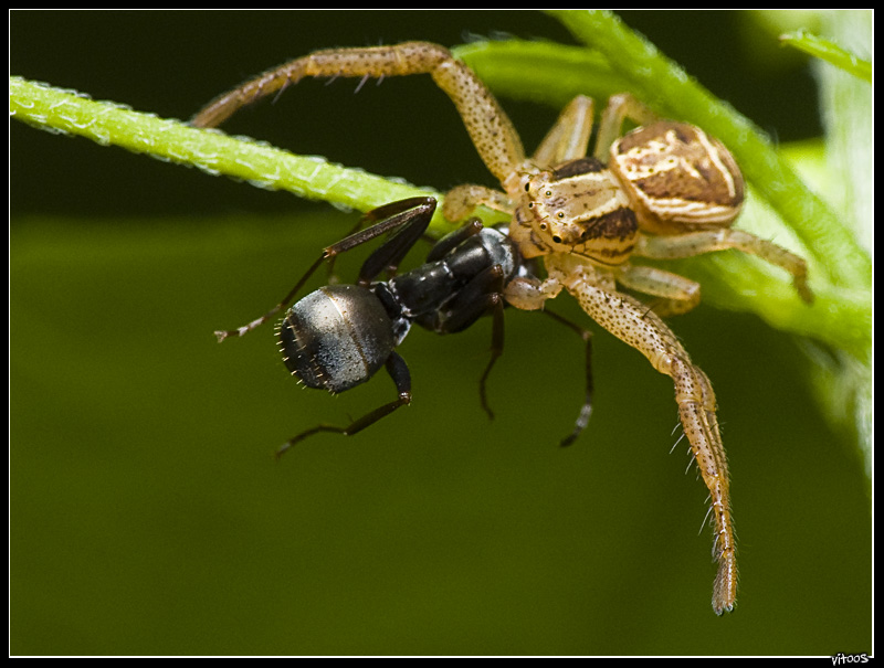 Pan Bokochód (Xysticus) przyłapany, jak siedział sobie pod listkiem i mocno trzymał świeżo złapaną mrówkę 😉 Na śniadanko.