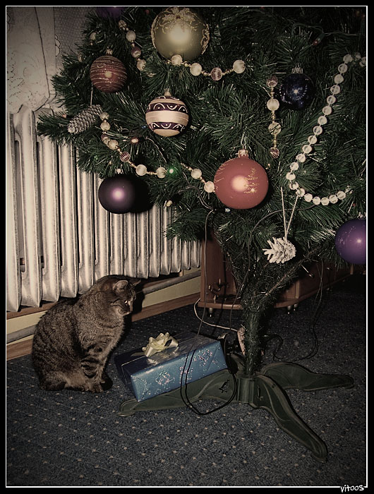 …zastanawiała się dziś Matylda. Leży od Wigilii pod choinką, nikt sie o niego nie upomina, to tak sobie pomyślałam, może opakowanie pysznego Kitiketa? Chociaż tak na węch, to nie bardzo, ale może nowy kocyk, poducha?