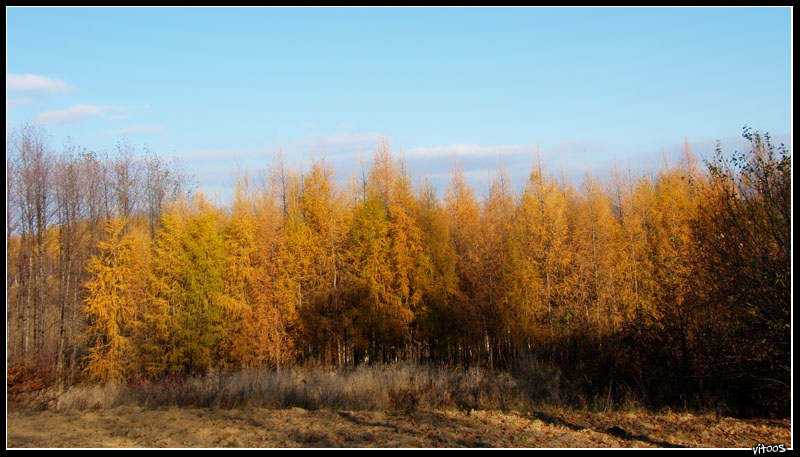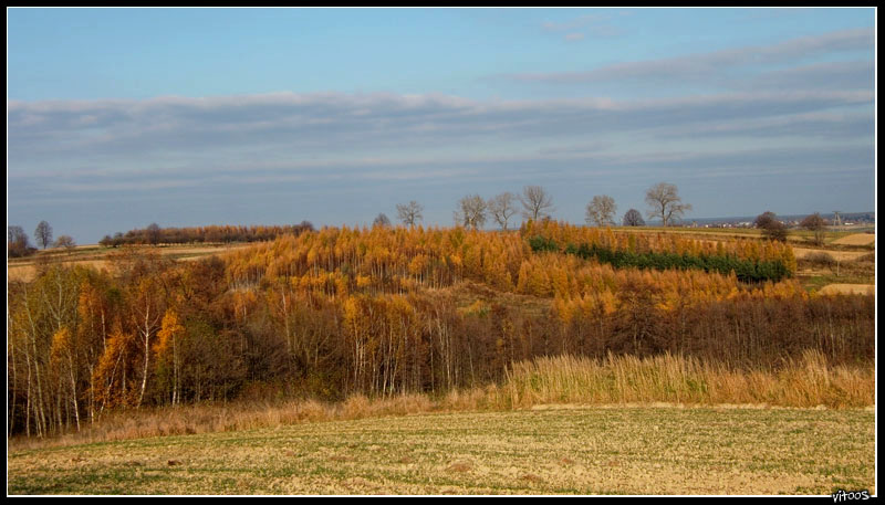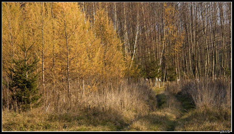 Podczas swoich wędrówek po bliższej i dalszej okolicy natrafiłem na ogromny młody lasek modrzewiowy.