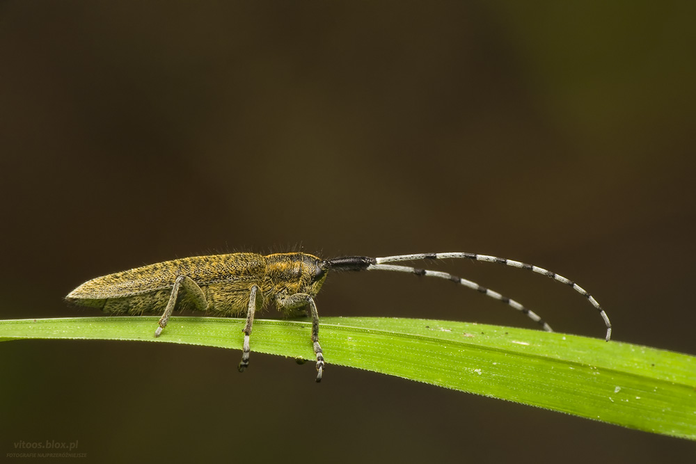 Zawsze miałem chętkę na tego chrząszcza, dopiero w poprzednim sezonie spotykałem go aż nader często. Przeważnie w gęstej trawie, ale tu siedział na pojedynczej trawce i co rusz machał czułkami. To Zgrzytnica zielonkawowłosa (Agapanthia villosoviridescens).