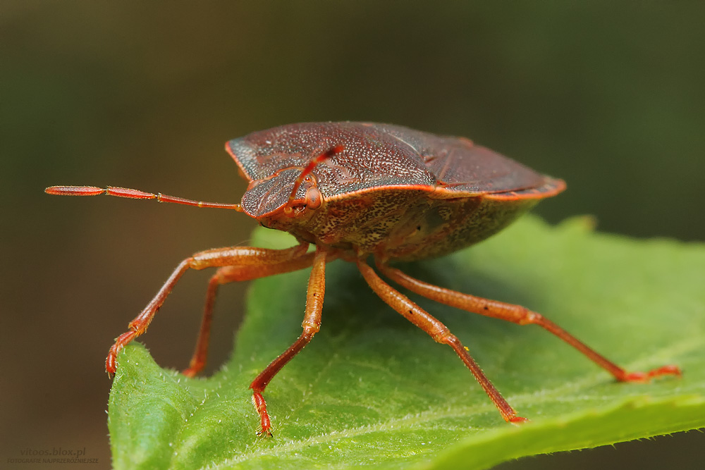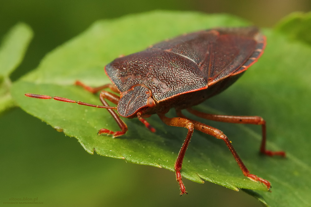 Już z półtorej godziny cierpliwie szukałem owadów do fotografowania. Powiedziałem sobie, a raczej moje kolana powiedziały mnie – koniec klęczenia i kucania. Kiedy tylko podniosłem się na proste nogi, na wysokości oczu na młodych listkach jakowegoś drzewa zauważyłem tego pluskwiaka.