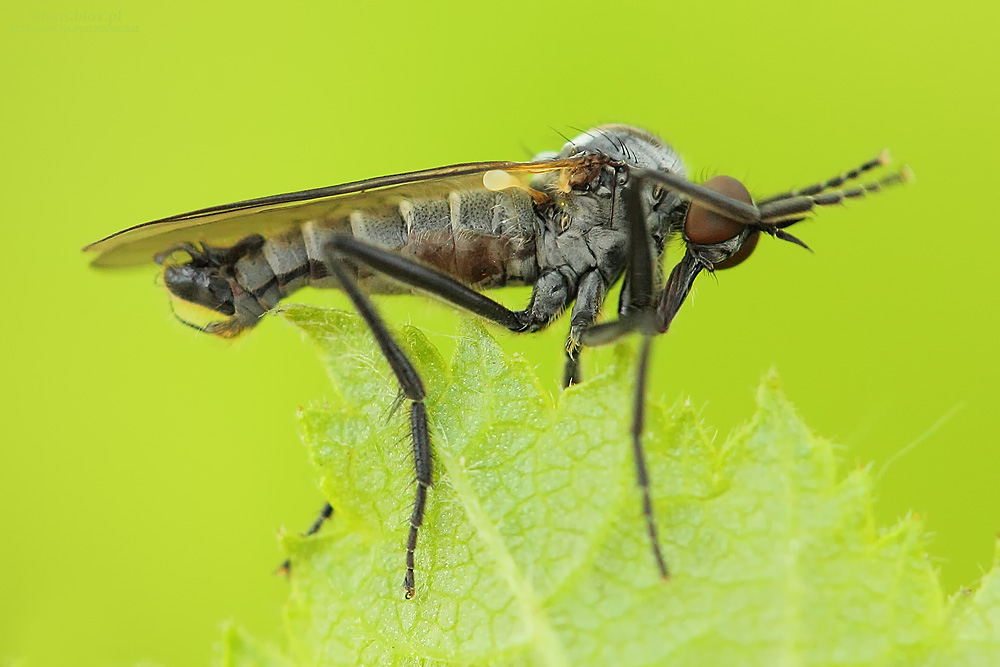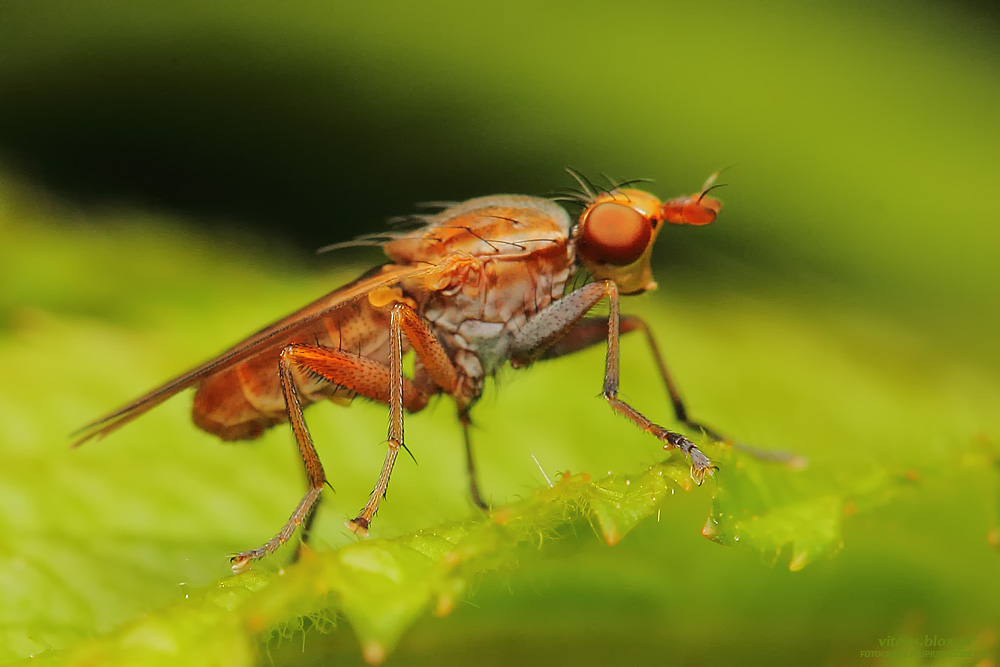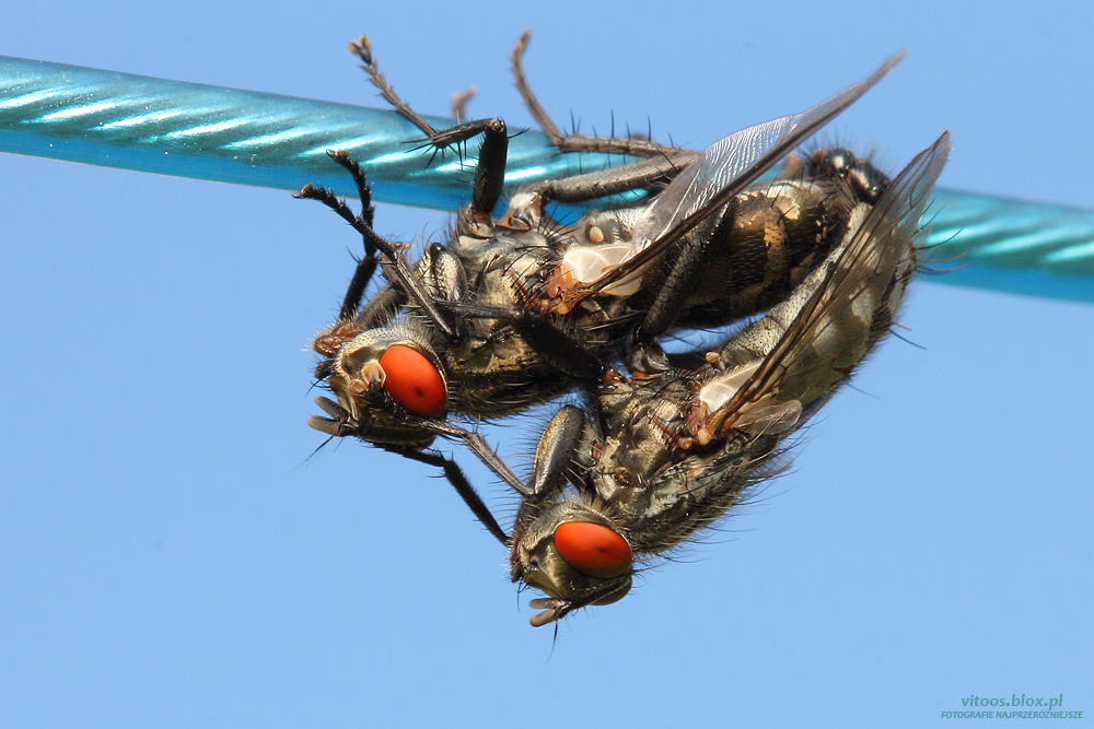 Przeglądałem listki berberysu w poszukiwaniu owadów. Dostrzegłem leżącą na plecach muchę. Pomyślałem, że wyluzowała się na maksa. Ale nie, po chwili zauważyłem, że trzyma ją w zębach zielony pajączek.