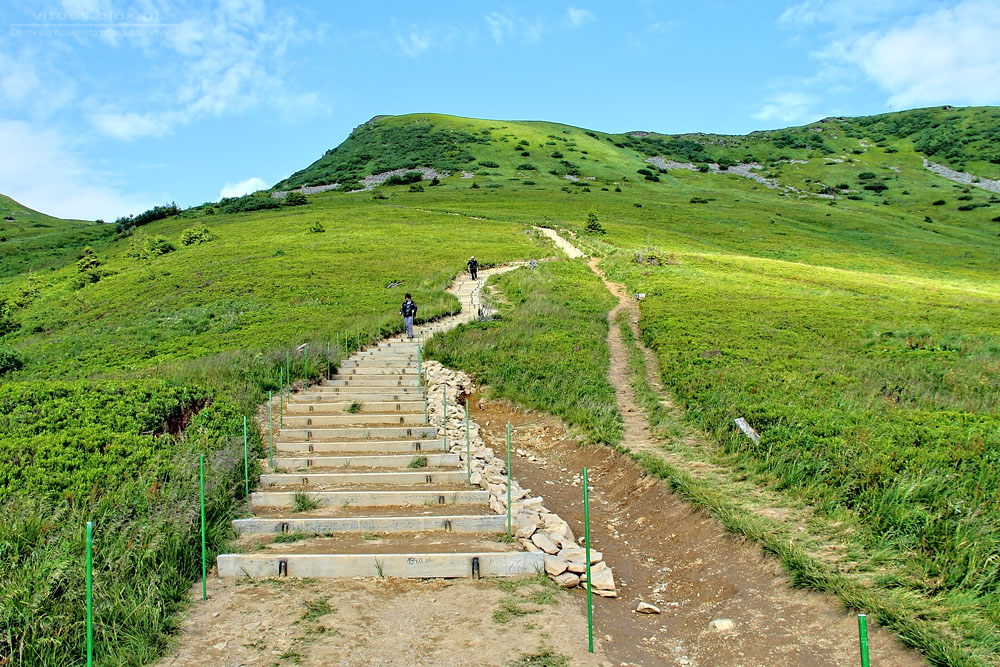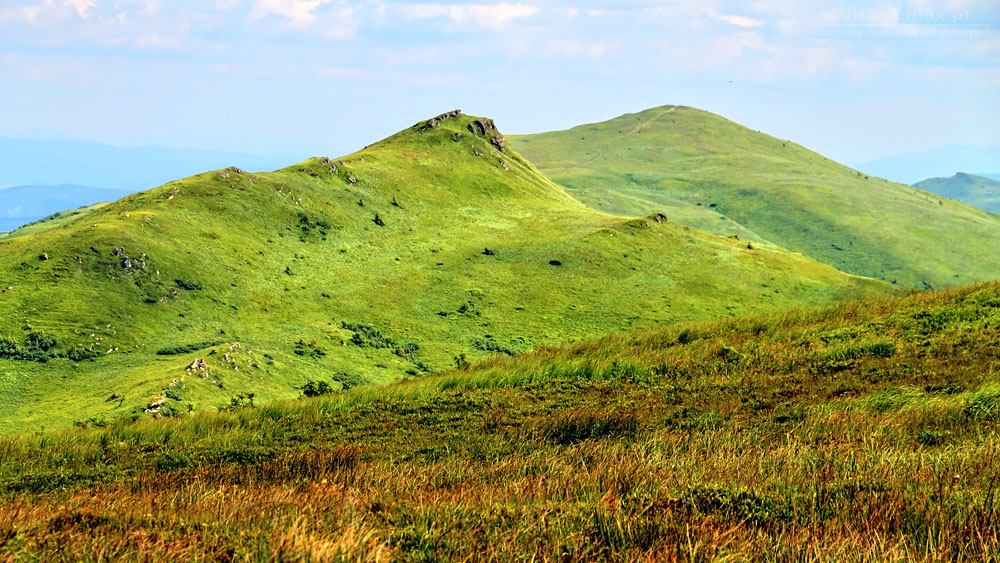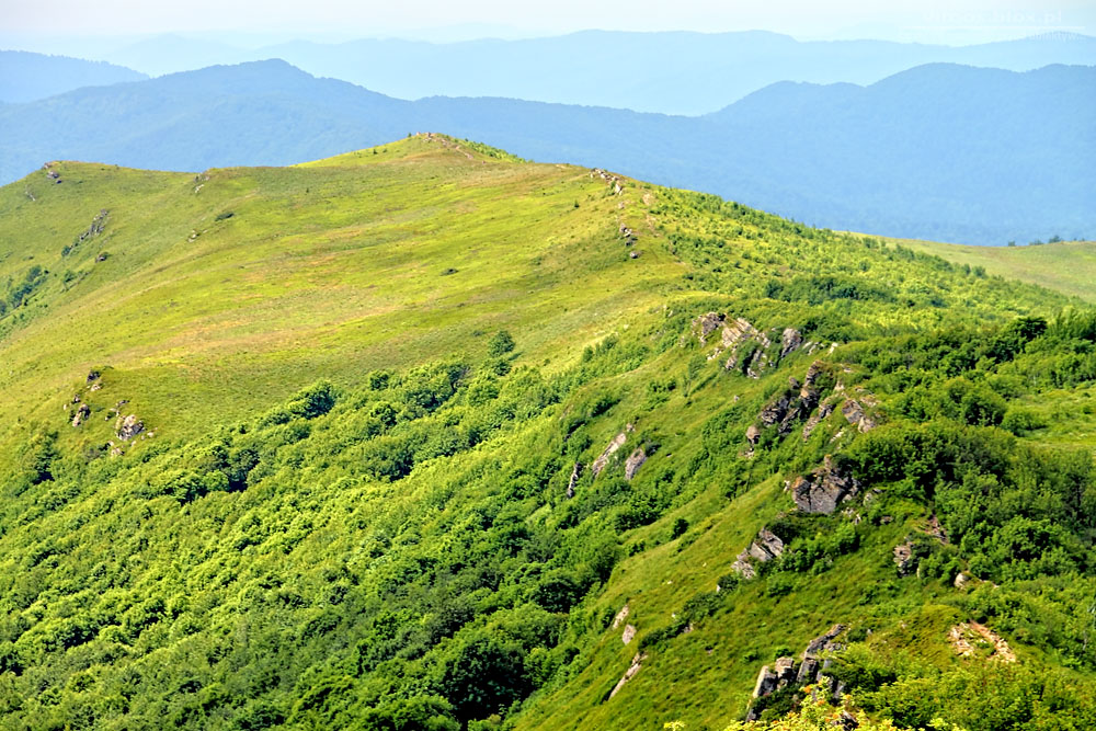 I szersza panorama na Halicz (na lewo) i Rozsypaniec. Akurat remontowane były szlaki w Bieszczadach. Po lewej stronie (takie białe kropki) widać przygotowane pakiety belek do wzmocnienia ścieżki.