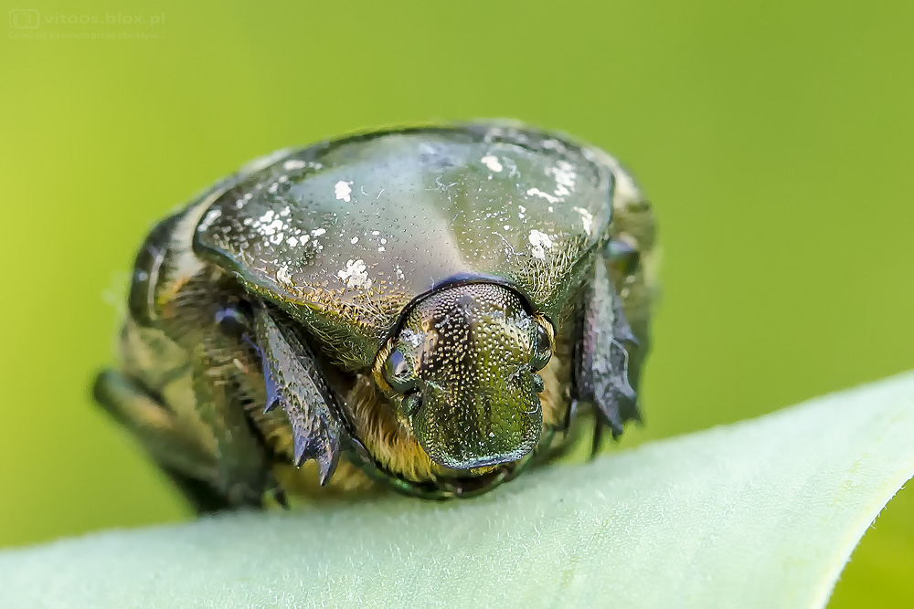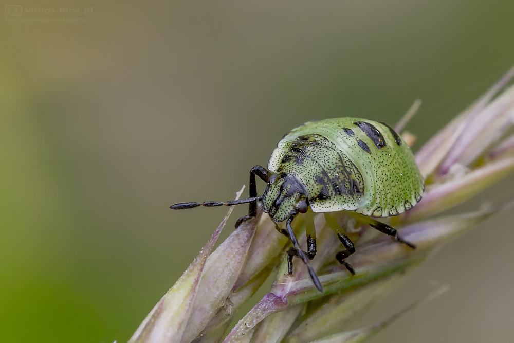 Na taka scenkę natknąłem się na liściu przekwitniętego irysa. Najpierw zauważyłem larwę (najprawdopodobniej złotooka) trzymającą w zębach mrówkę. Po drugiej stronie liścia siedział pająk, który kiedy tylko ruszyłem liściem, natychmiast przybiegł, bo jak się okazało, to była jego zdobycz.