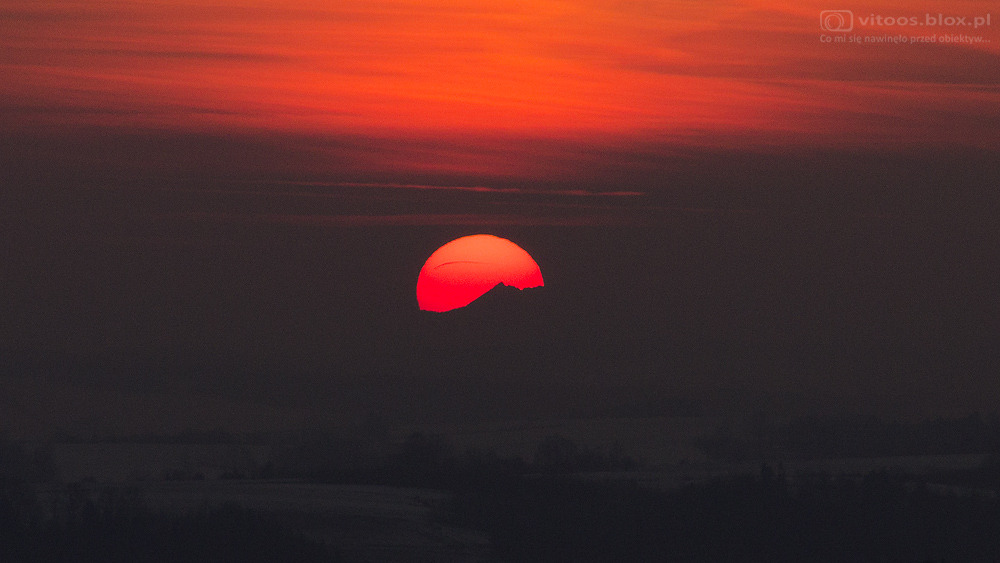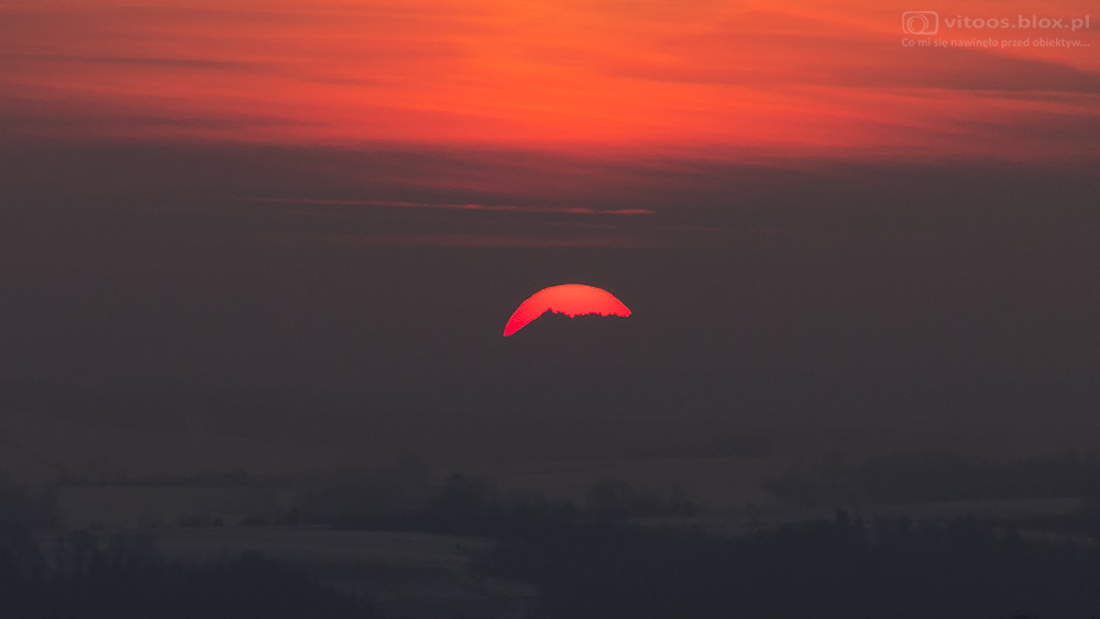 Wczoraj przegapiłem, ale co to za frajda widzieć Tatry jak wszyscy widzą… Dziś może nie tak ładnie, jak przed dwoma tygodniami, ale na kilka minut, mimo sporego zachmurzenia i smogu pokazały się Tatry na tle tarczy słonecznej. Odległość, przypominam, ok. 136 kilometrów.