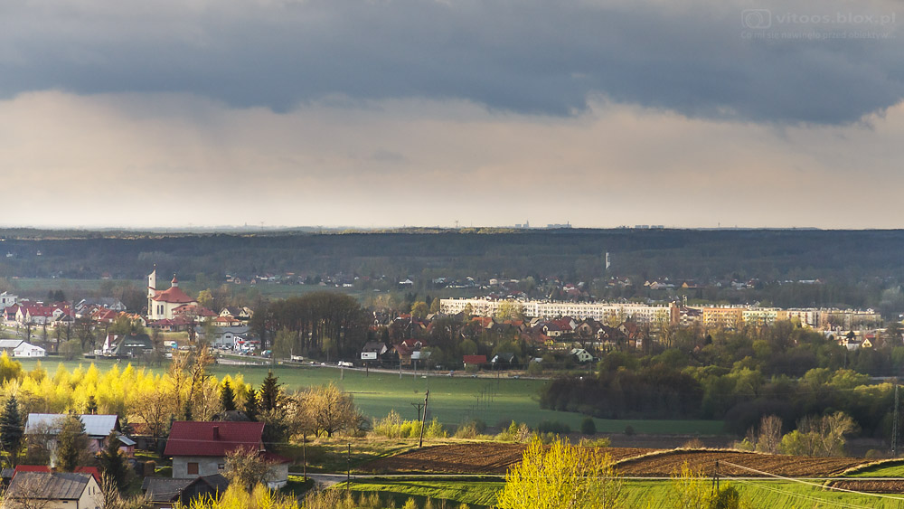 Mimo chmur, widoczność była znakomita, na zdjęciu na horyzoncie zabudowania odległego o kilkadziesiąt kilometrów Mielca.