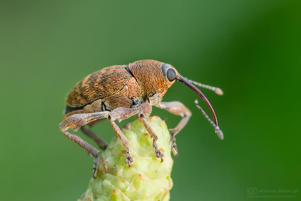 Zaszedłem do dzikiej części ogrodu zobaczyć co tam u moich knieżyc, ale moją uwagę przykuła dziwna kulka z długim ogonkiem. Okazało się, że to niewielki słonik – chrząszcz, najprawdopodobniej Curculio nucum (Słonik orzechowiec). Obok rośnie orzech, więc bardzo prawdopodobne, że to właśnie on.