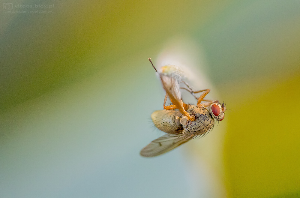Lubie te niewielkie muszki o czerwonych oczach. Tę spotkałem latem na juce rosnącej w ogrodzie. Niestety w tym miejscu było dość ciemno i na zdjęcie wkradł się spory szum.
