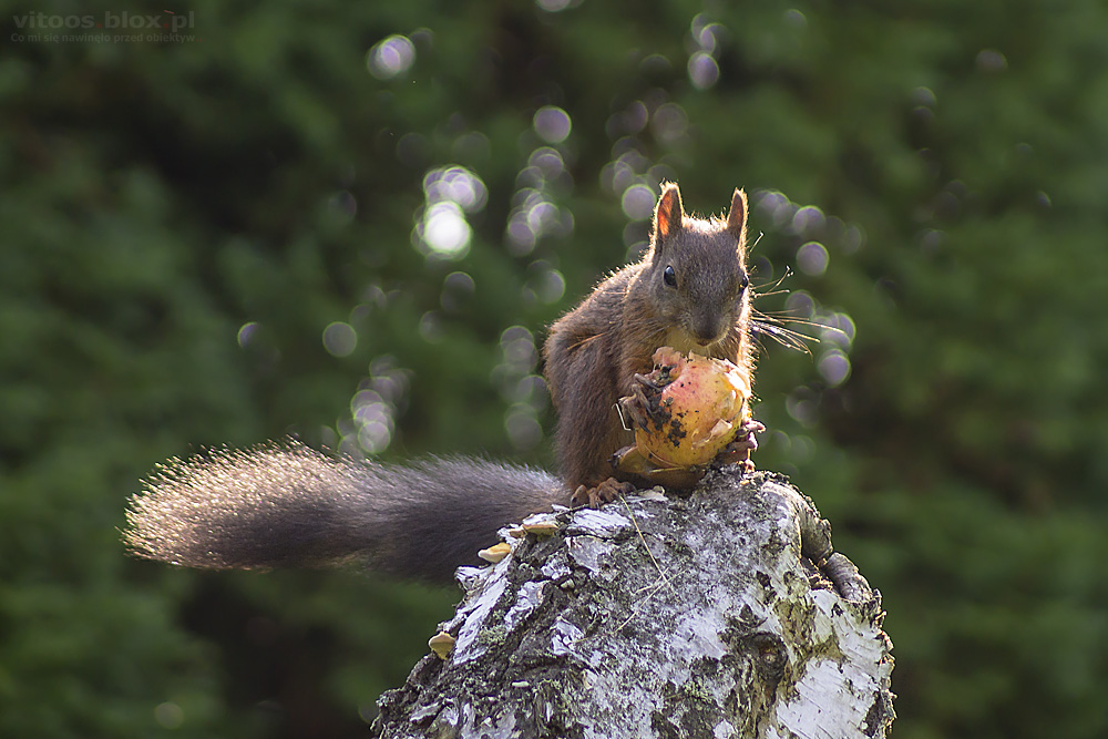 Znalazła jeszcze jakieś resztki jabłek leżących pod jabłonką. Wiewiórka, być może nie ciągle ta sama) zagląda do ogrodu całkiem często i pozwala podchodzić do siebie coraz bliżej. Chyba powinienem jej już nadać jakoweś imię 😉
