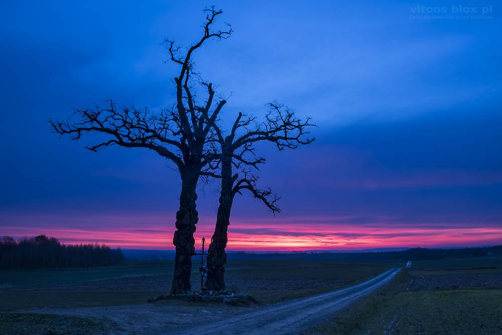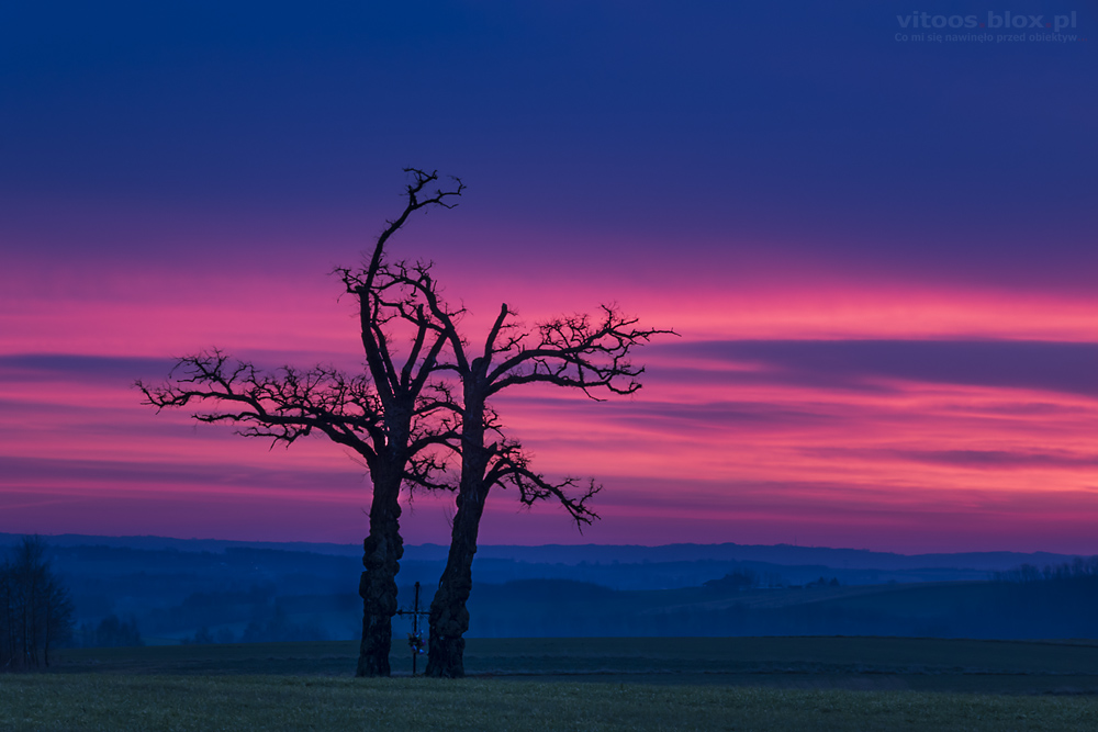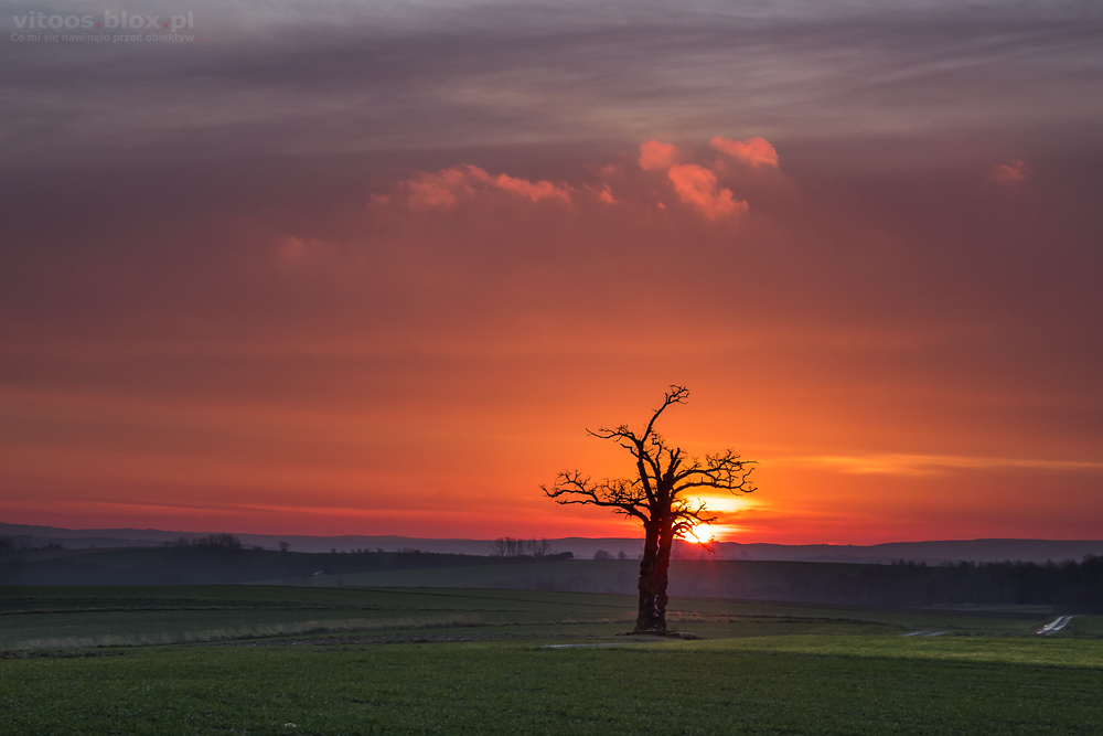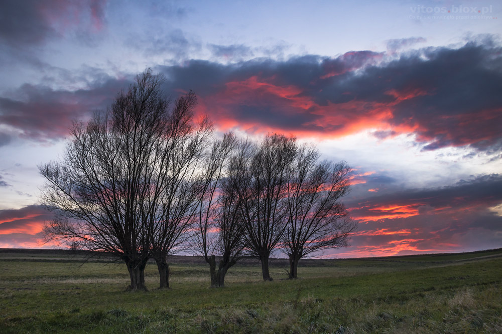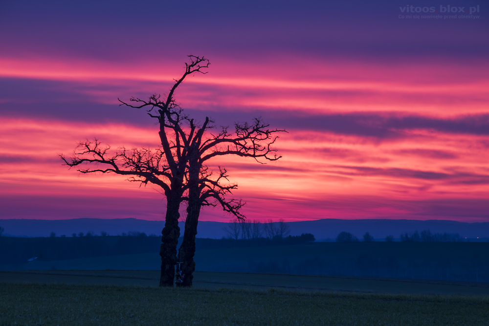 Jesienią i zimą czekam na weekendy z utęsknieniem. To jedyne dni kiedy, jeśli nie pada, mogę wyjść na zdjęcia. W sobotę byłem na nogach już godzinę przed wschodem słońca. I już wtedy niebo zaczęło robić się kolorowe! Pierwszy raz spotkałem się z czymś takim. A ja musiałem się jeszcze ubrać i podjechać pod akacje. Pierwsze cztery zdjęcia powstały jeszcze zanim wzeszło słońce, a dwa ostatnie w momencie pojawienia się słońca nad horyzontem. Chwilę później niebo zrobiło się już normalne…
