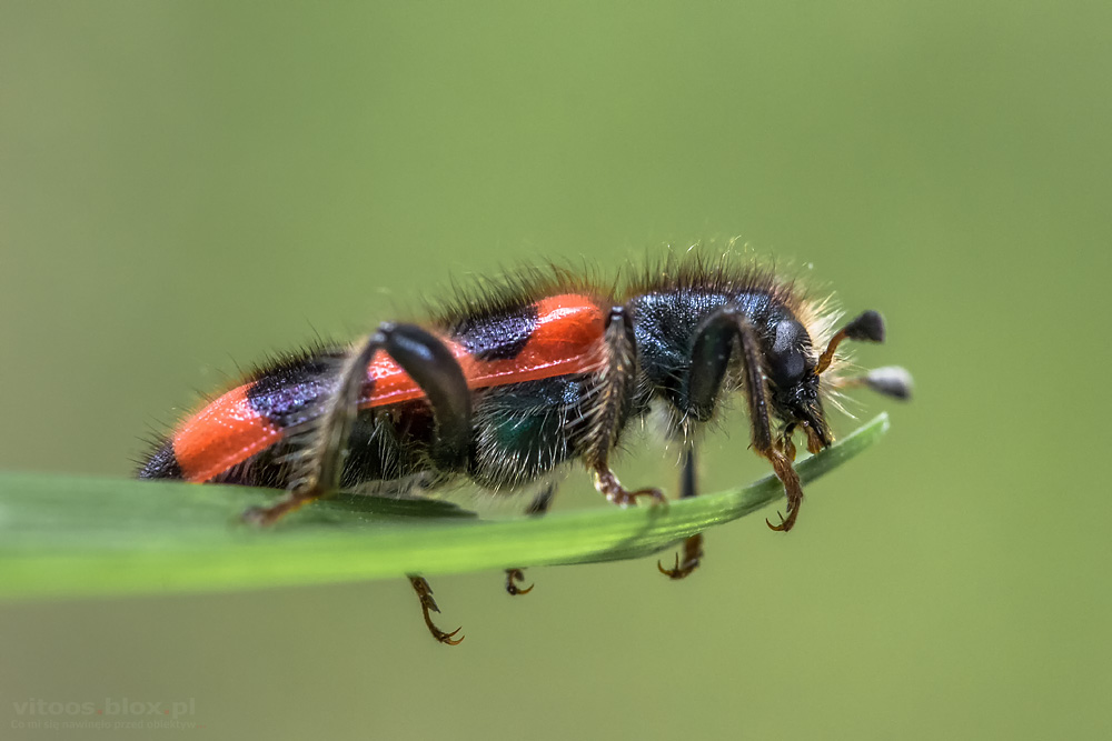 Minęło cztery lata od naszego ostatniego fotograficznego spotkania. Tym razem barciela pszczołowca (Trichodes apiarius) spotkałem w ogródku na kwiatku czosnku. Jak to one mają w zwyczaju, wylegiwał się znudzony i delektował wolną niedzielą.