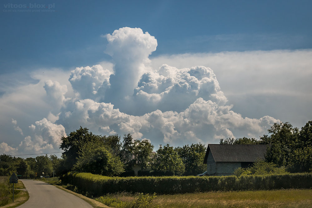 Zdjęcia, które dziś pokażę zrobiłem 27 maja. Na południu, kilkadziesiąt kilometrów od miejsca mojej obserwacji piętrzyła się potężna chmura burzowa. Byłem od niej ok 40 – 50 km, ale za nią widać kowadło innej chmury, znajdującej się jeszcze dalej. Można sobie zatem wyobrazić, jakie to kolosy.