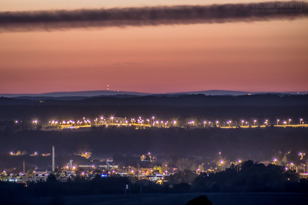 Bezchmurna noc z dobrą przejrzystością powietrza. Postanowiłem obadać, czy przypadkiem nie widać Gór Świętokrzyskich. Podjechałem na punkt widokowy, a tam… mimo, że była już 22-ga, Góry świętokrzyskie jak na dłoni.