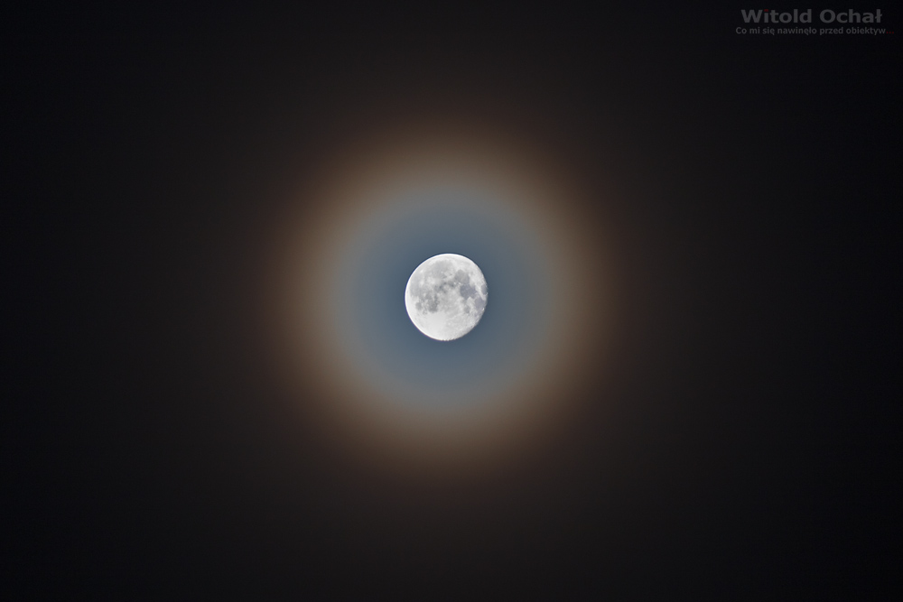 Ani jednej chmurki, za to niezbyt gęsta mgła. Efekt – niesamowity wieniec księżycowy.