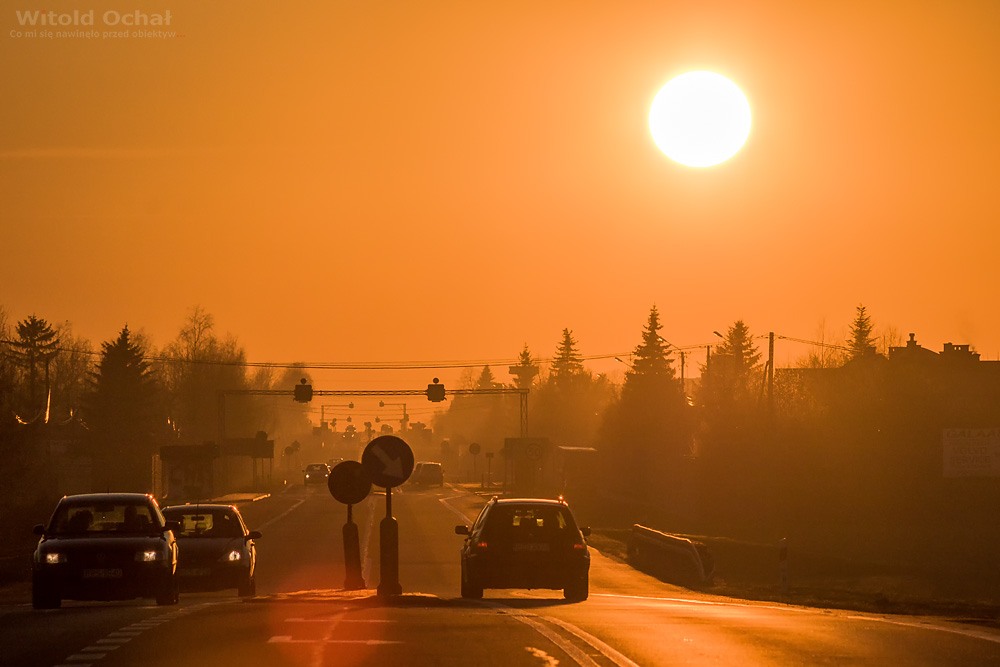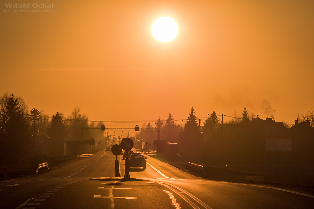 Od kilku sezonów próbuję złapać zachodzące słońce dokładnie nad poniższym odcinkiem drogi. Sęk w tym, że możliwe to jest dwa razy w roku. W okolicy równonocy wiosennej i jesiennej. Dotąd nie dopisywała pogoda, albo nie miałem czasu. Podobnie i tym razem. Spóźniłem się o kilka dni, niestety wcześniej przeszkadzały chmury.
