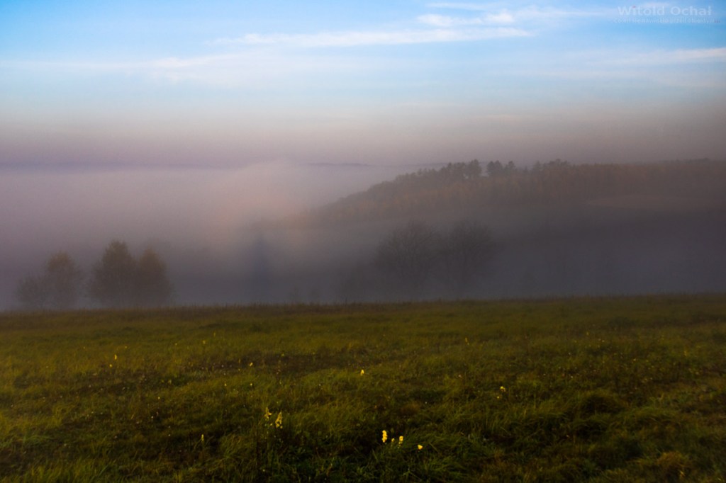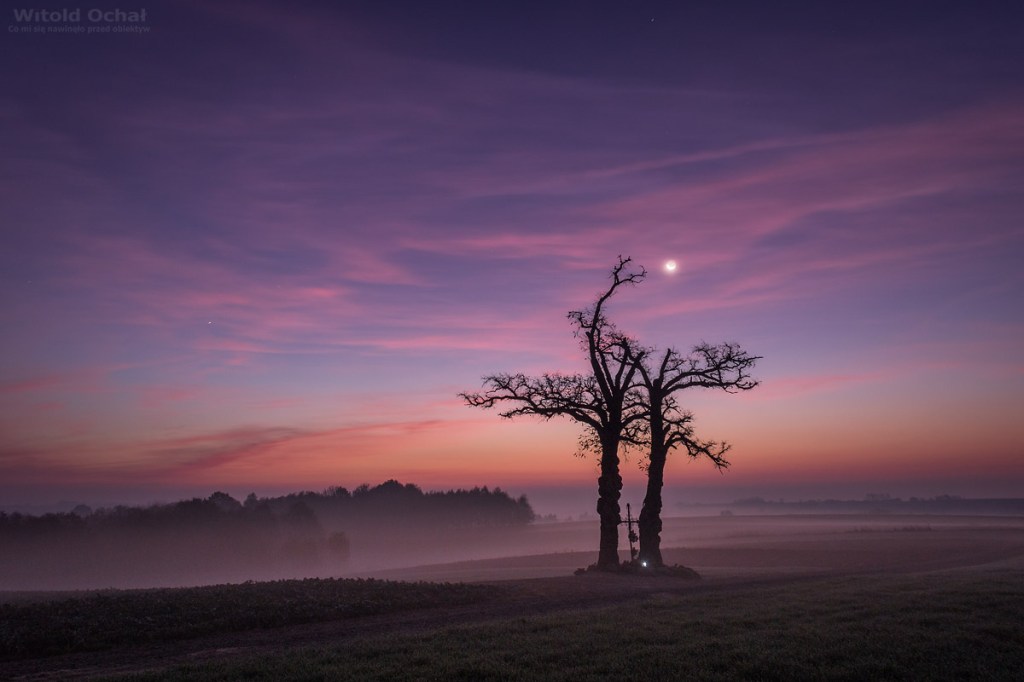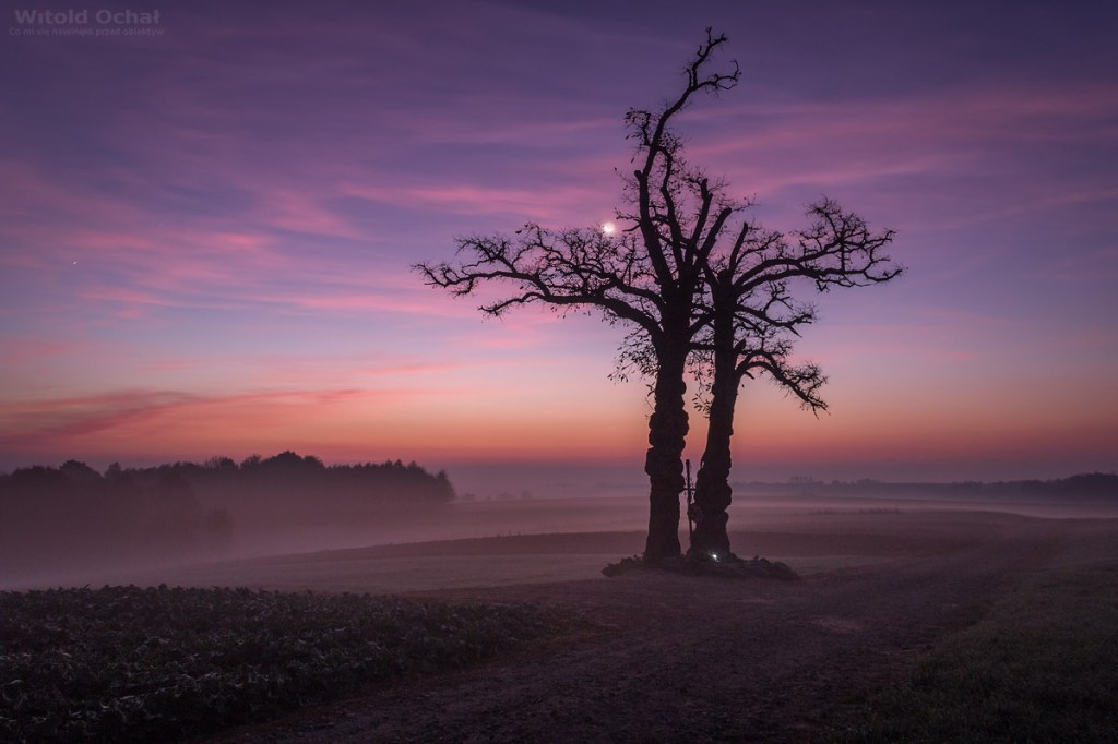 W niedzielę przed świtem wybrałem się na zdjęcia i po sfotografowaniu Księżyca (https://witoldochal.blog/2019/10/27/rogalik-z-gratisem/) zacząłem szukać po okolicy jakiegokolwiek miejsca z mgłami. Udało mi się to dość szybko i tam postanowiłem poczekać na wschód słońca.
