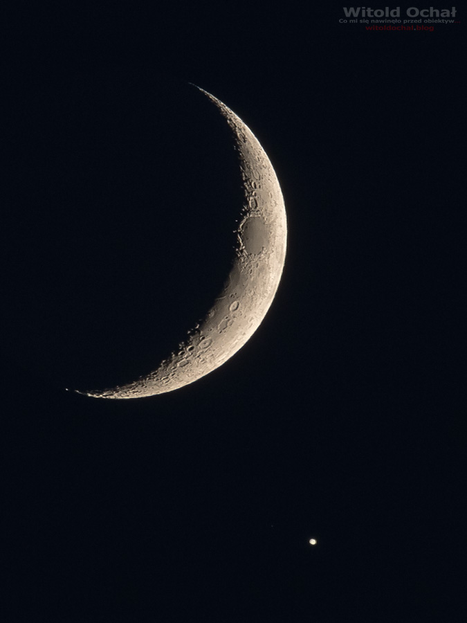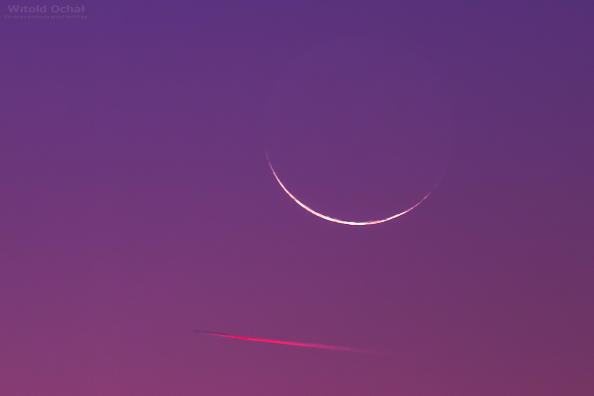 Na pierwszy ogień do fotografowania poszedł cieniutki sierp Księżyca (tylko 1,4 % tarczy) z delikatnym światłem popielatym, na pięknym różowym niebie. Do wschodu słońca było jeszcze około pół godziny.