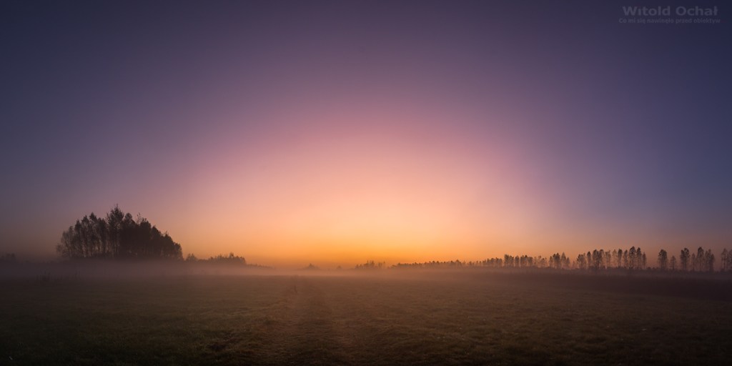 W pewnym momencie (około 10 minut przed wschodem) niebo pojaśniało na kilka minut, ale gołym okiem nie widziałem tego, co wyszło mi na szerokiej panoramie złożonej z pięciu pionowych ujęć. Jasna poświata, czy łuna z kolorowymi pierścieniami. Nie mam pojęcia co to, więc roboczo nazywam to zjawisko „poświatą od wschodzącego we mgle słońca” 🙂