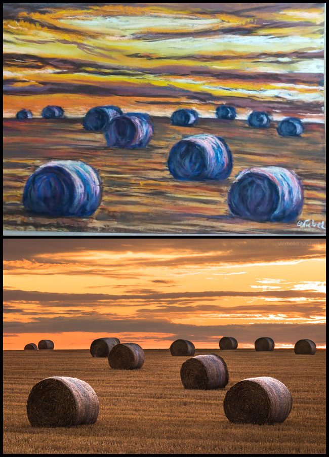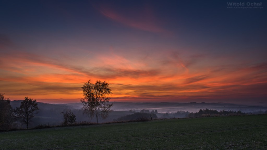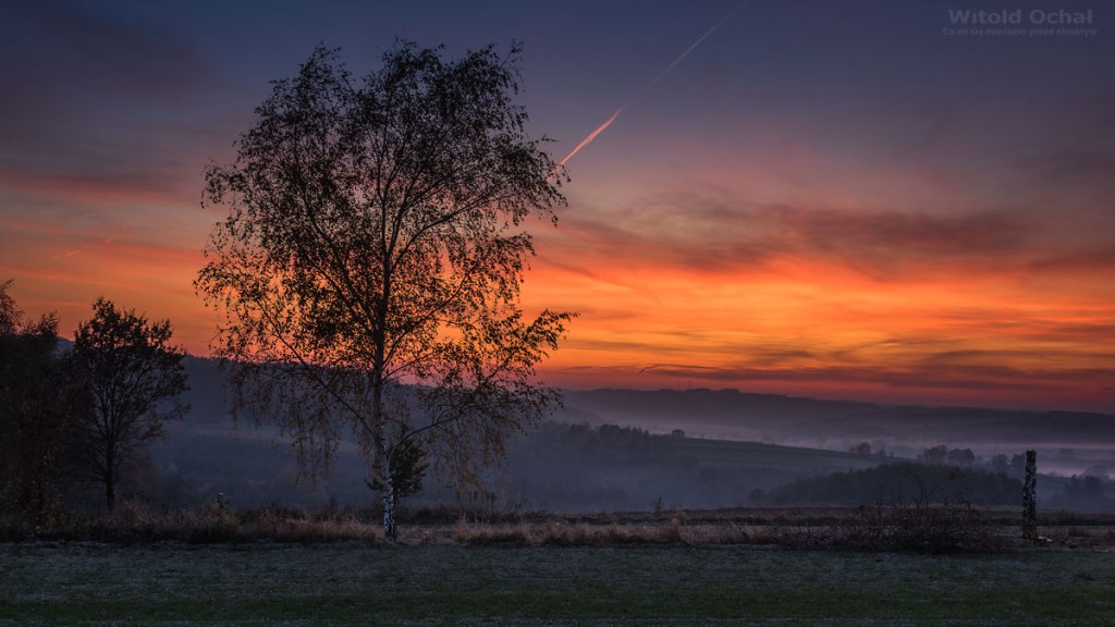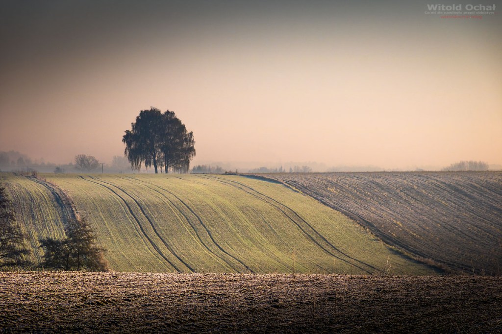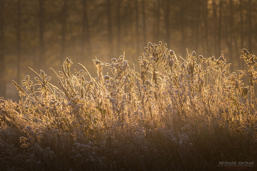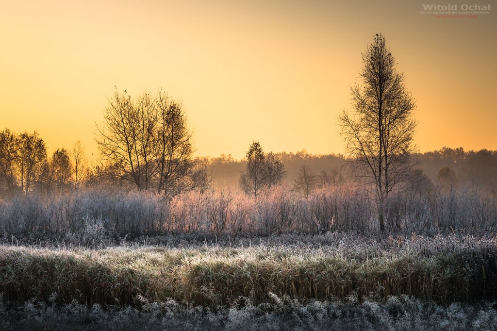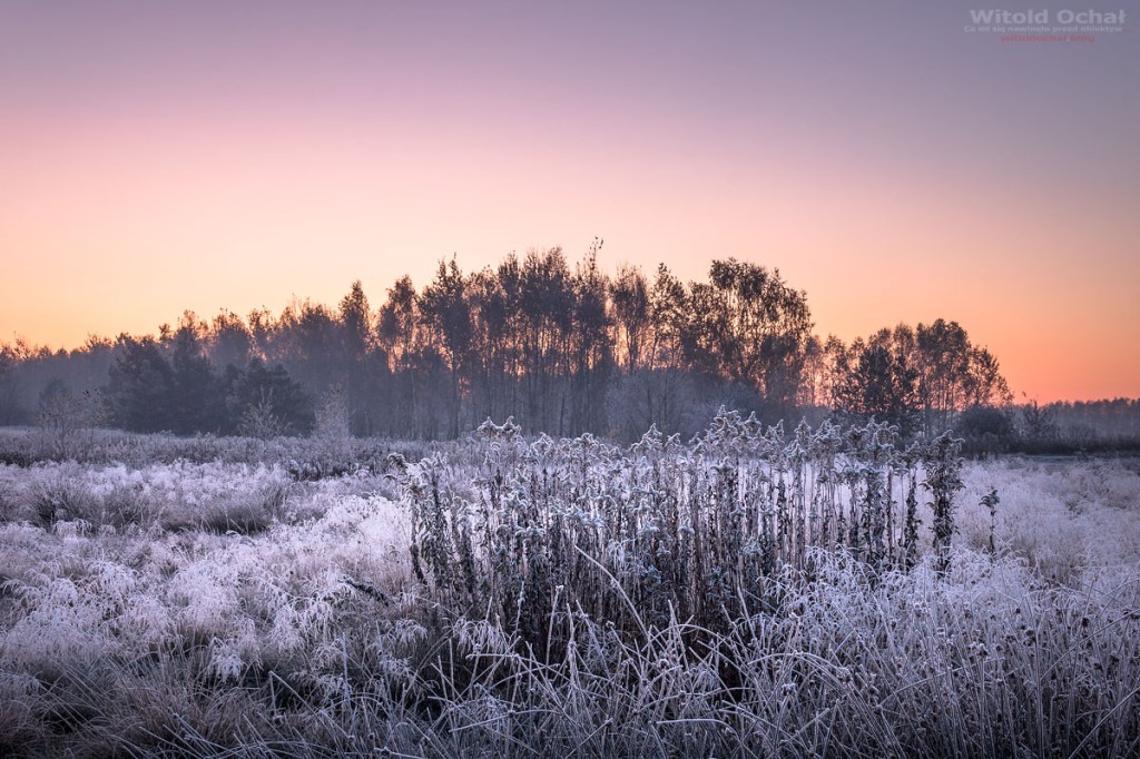 Niewielki przymrozek, ale wystarczający do pięknych porannych krajobrazów. Mnie najbardziej podoba się to światło na pierwszym zdjęciu, kiedy słońce dopiero dociera do horyzontu. Te chłodne, fioletowawe barwy. Pozostałe zdjęcia zostały zrobione jakąś niespełna godzinkę później.