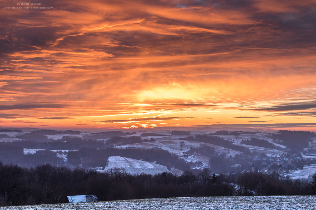 FOT. WITOLD OCHAŁ POWIAT STRZYŻOWSKI FOTOGRAFIA KRAJOBRAZOWA PSTRĄGOWA PODKARPACIE ZACHÓD SŁOŃCA POLA POD ŚNIEGIEM PO ZMROKU