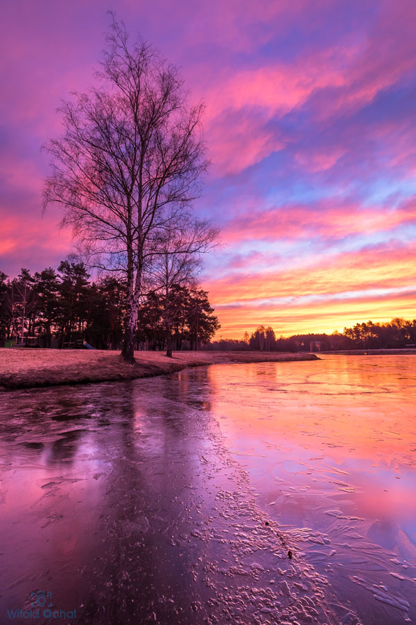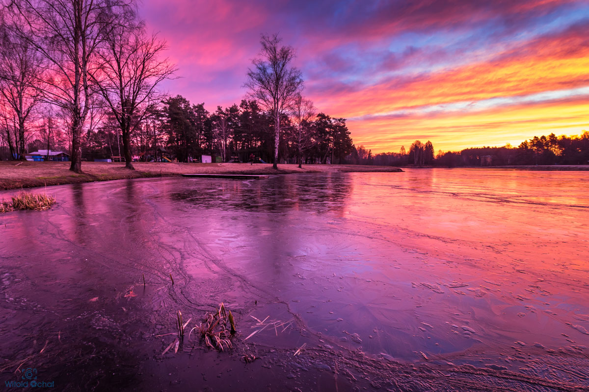 FOT. WITOLD OCHAŁ POWIAT ROPCZYCKO-SĘDZISZOWSKI FOTOGRAFIA KRAJOBRAZOWA PODKARPACIE KAMIONKA ZALEW W KAMIONCE WSCHÓD SŁOŃCA W RÓŻOWYCH BARWACH WODA MRÓZ LÓD
