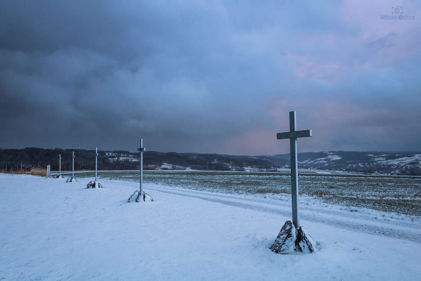 FOT. WITOLD OCHAŁ POWIAT ROPCZYCKO-SĘDZISZOWSKI FOTOGRAFIA KRAJOBRAZOWA GÓRA ROPCZYCKA ZACHÓD SŁOŃCA ALEJA JESIONOWA PROMIENIE NA NIEBIE