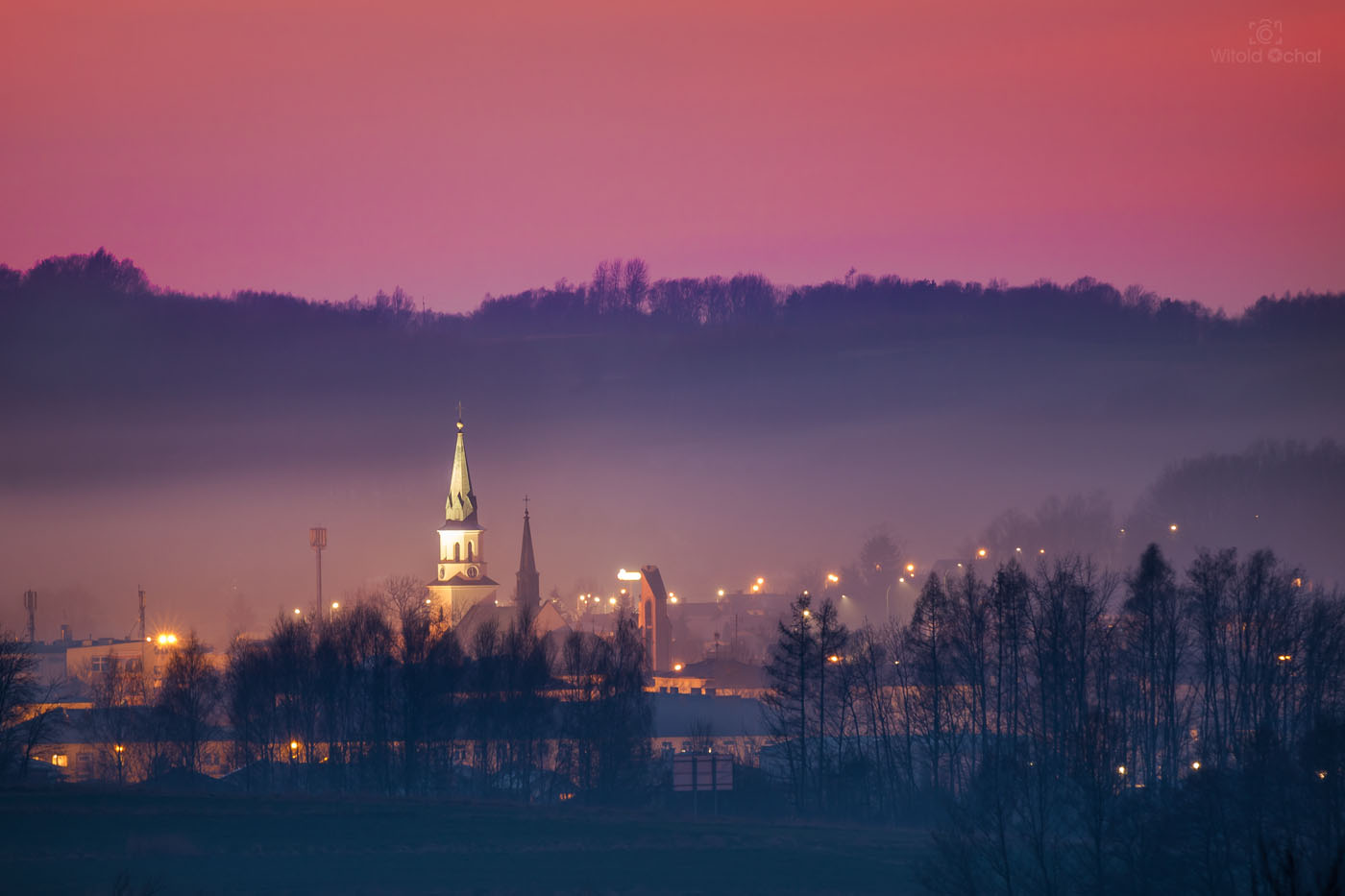 FOT. WITOLD OCHAŁ POWIAT ROPCZYCKO-SĘDZISZOWSKI FOTOGRAFIA KRAJOBRAZOWA ROPCZYCE PODKARPACIE KOŚCIÓŁ DŹWIG FABRYKA WIECZOROWĄ PORĄ