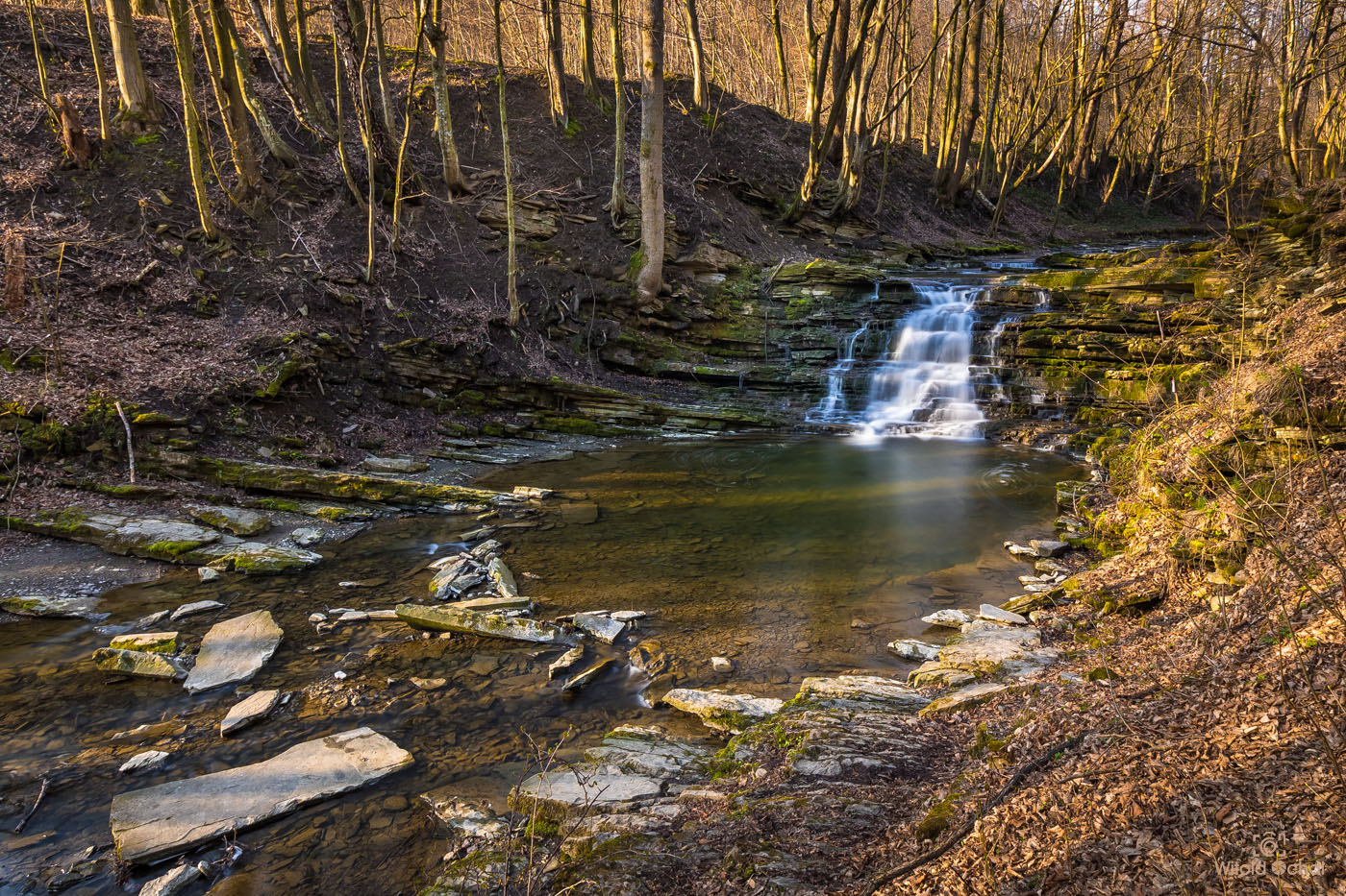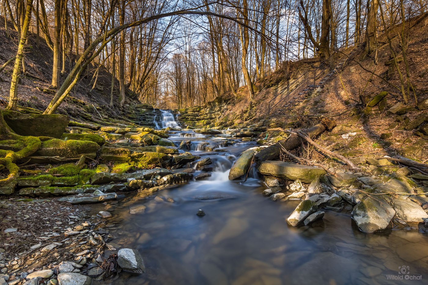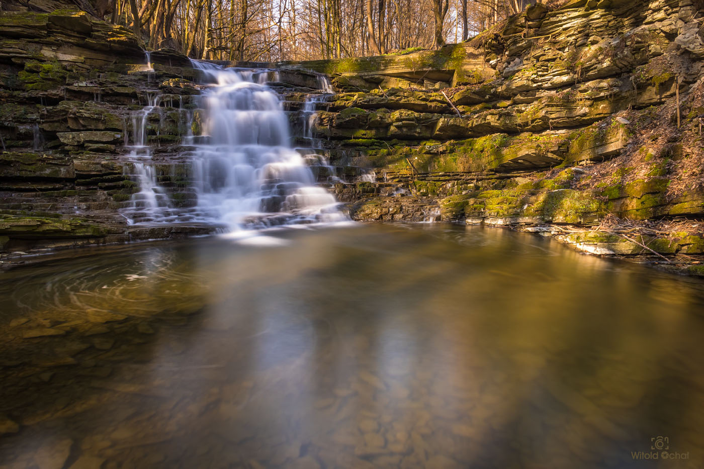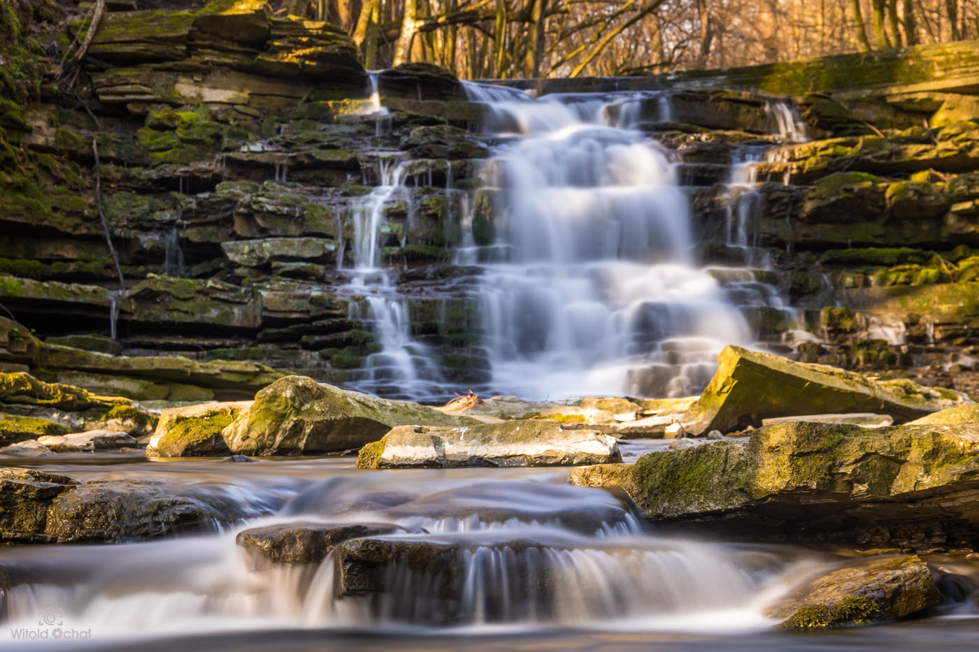 Niespiesznie wyjechałem z domu, bo tym razem nie miałem fotografować wschodu, tylko wodospad, a do tego nie było mi trzeba ładnego nieba. Na niebie nie było chmurek, a miękkie poranne światło fajnie wpadało między drzewami do skarpy wodospadu.