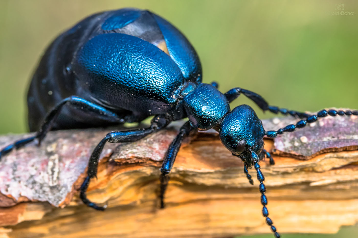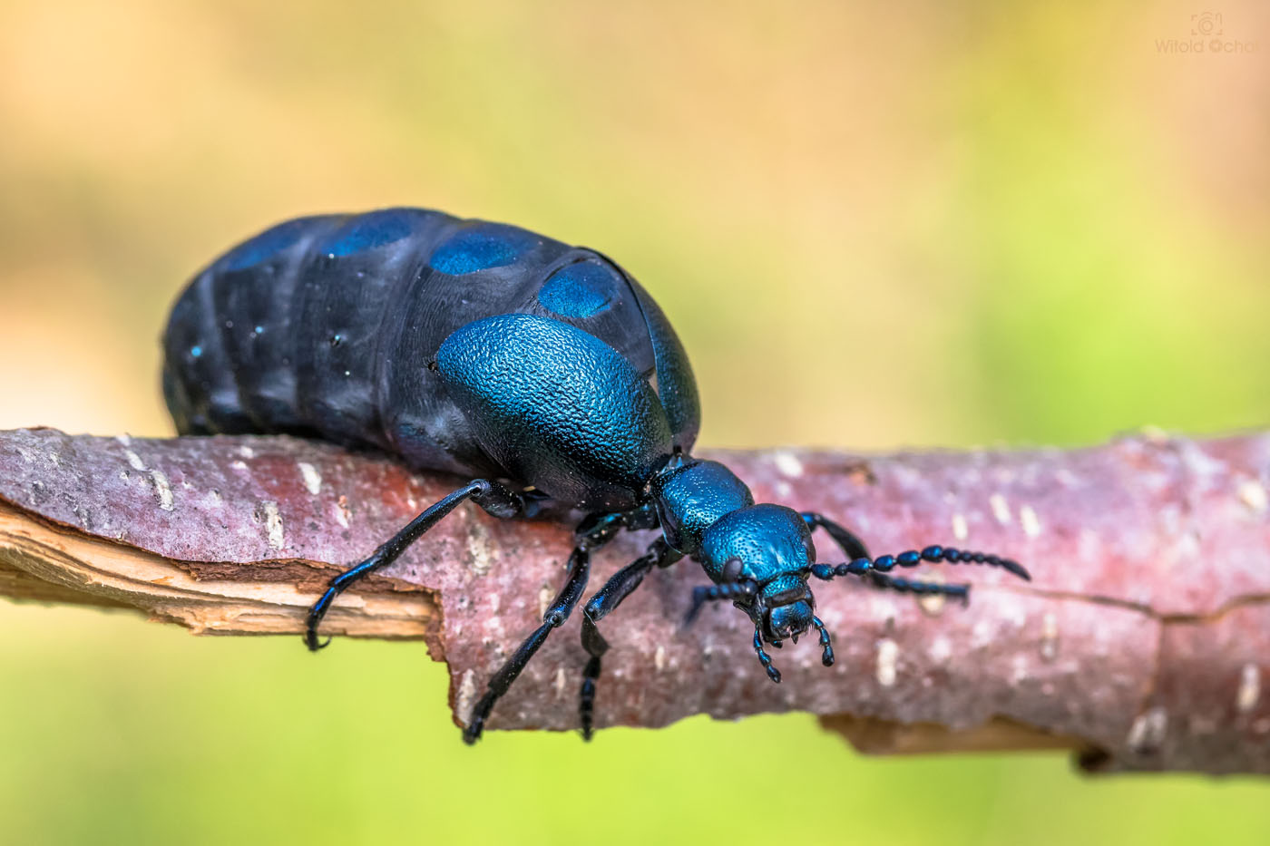 Końcem kwietnia odkurzyłem obiektyw do makro i wybrałem się na rekonesans po okolicy. Kiedy dotarłem do lasu, na ściółce zauważyłem coś dużego czarnego i to się ruszało. Już wiedziałem, że to oleica fioletowa (Meloe violaceus). Mniej więcej w tym samym miejscu spotykałem ją wcześniejdwukrotnie.