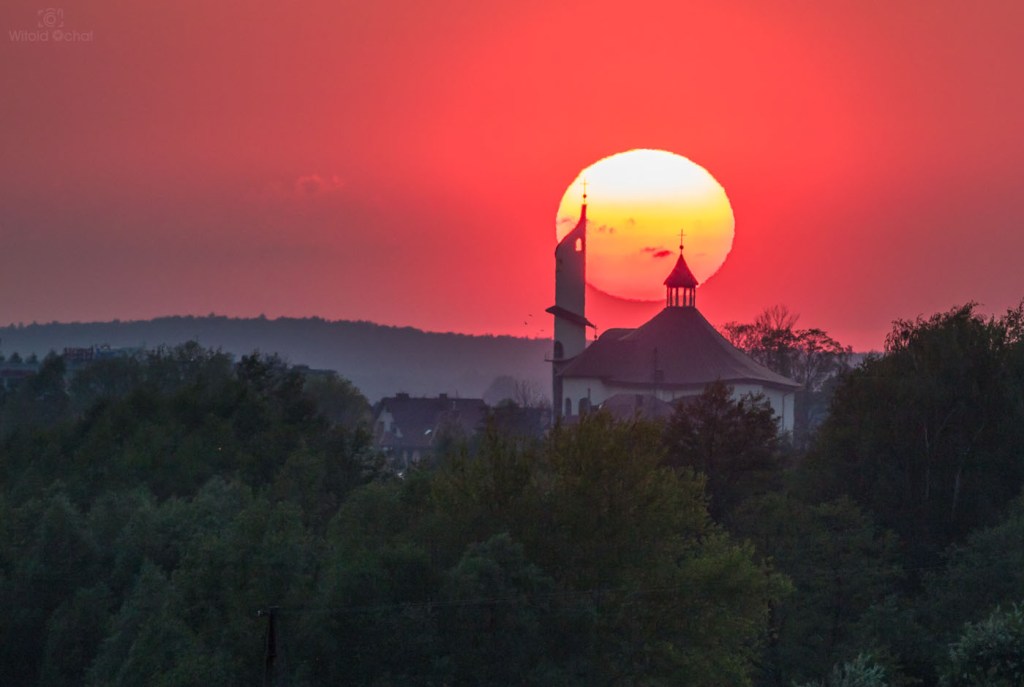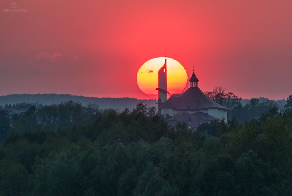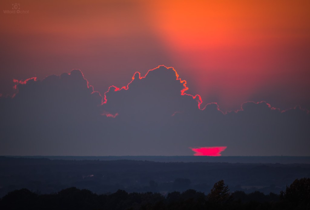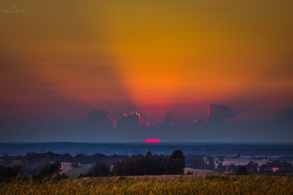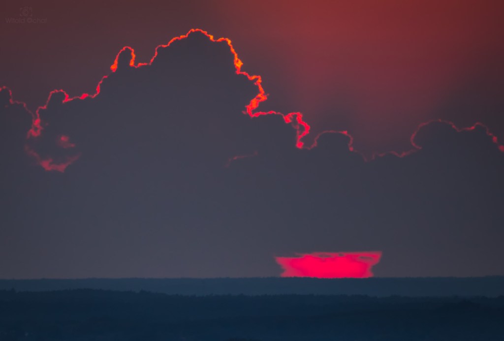 W ciągu dnia przechodziły liczne burze nad Polską, więc w powietrzu było mnóstwo wilgoci i atmosfera falowała jak wzburzone morze. Gdzieś tam hen daleko znajdowały się jeszcze burzowe chmury, a słońce znalazło sobie lukę miedzy nimi a horyzontem i w tej wąskiej szparce przybrało niesamowity kształt. Na skutek refrakcji atmosferycznej jego dół rozciągnął się przy samym horyzoncie tworząc zadziwiający kształt.