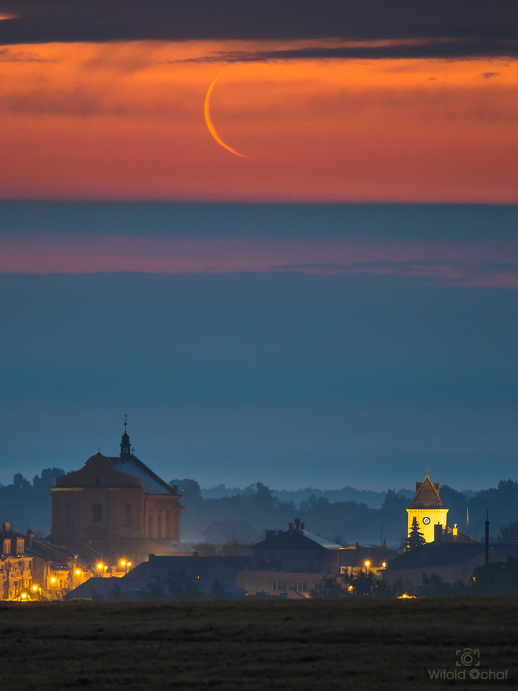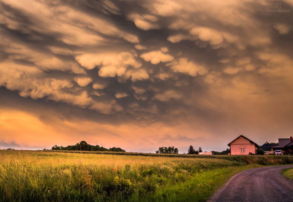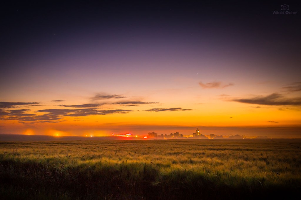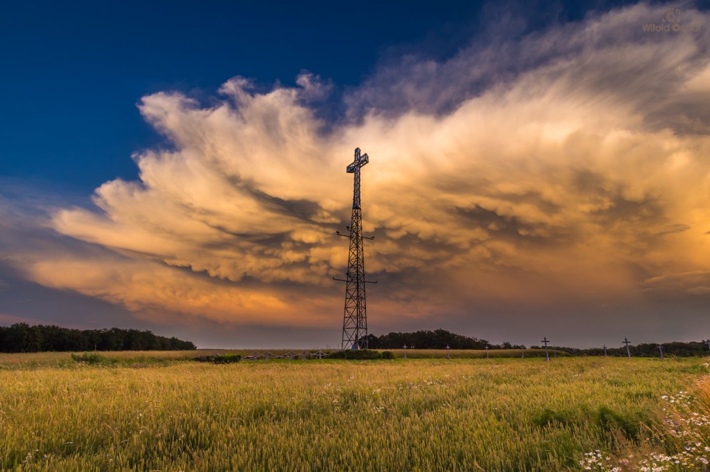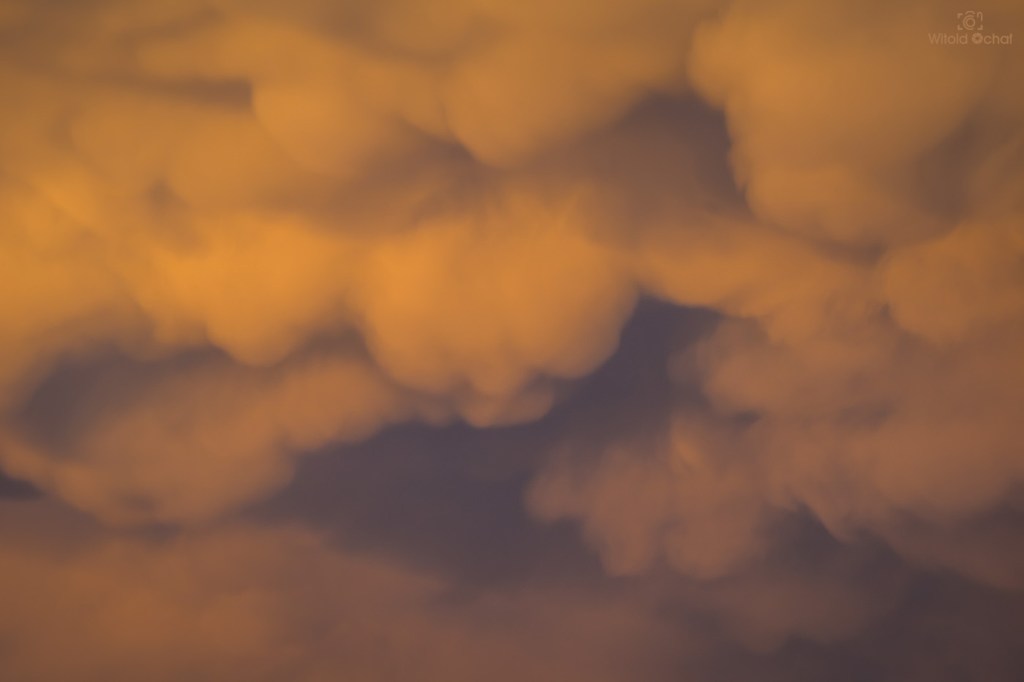 W ciągu dnia przechodziły liczne burze nad Polską, więc w powietrzu było mnóstwo wilgoci i atmosfera falowała jak wzburzone morze. Gdzieś tam hen daleko znajdowały się jeszcze burzowe chmury, a słońce znalazło sobie lukę miedzy nimi a horyzontem i w tej wąskiej szparce przybrało niesamowity kształt. Na skutek refrakcji atmosferycznej jego dół rozciągnął się przy samym horyzoncie tworząc zadziwiający kształt.