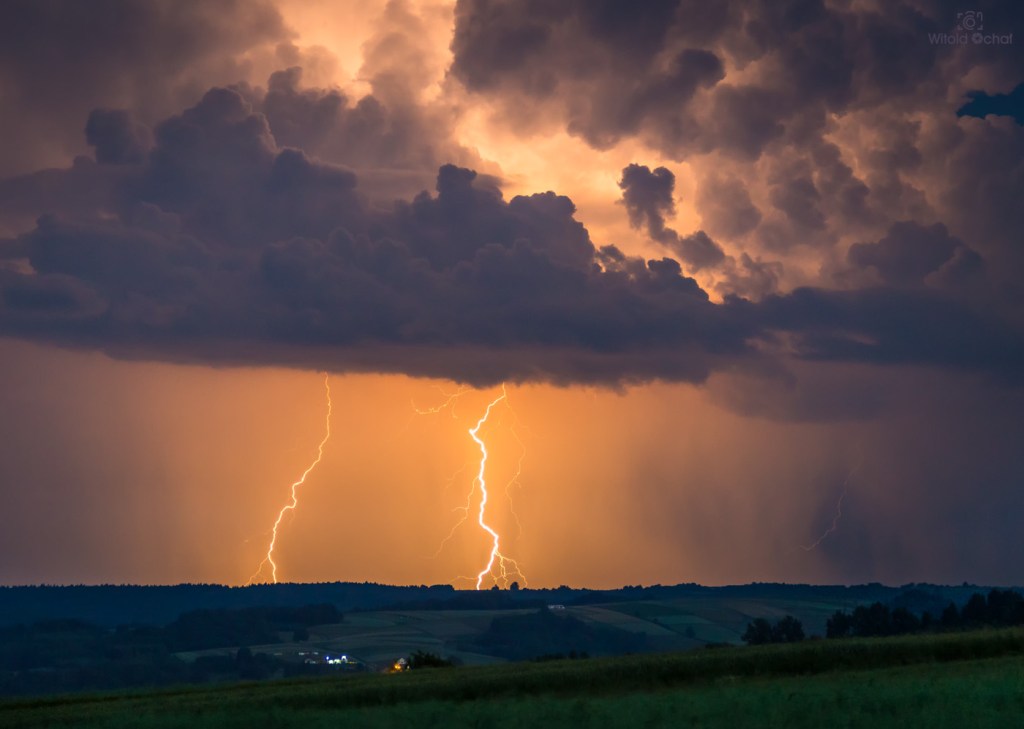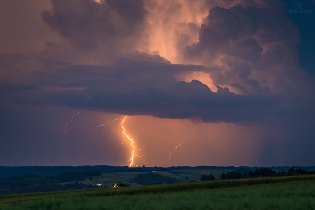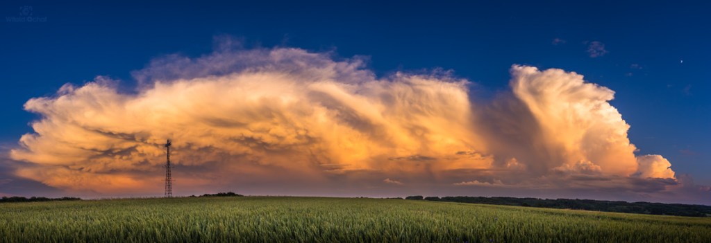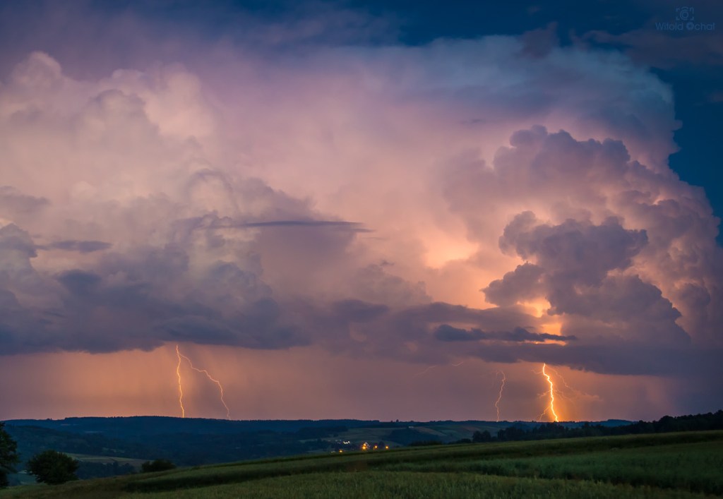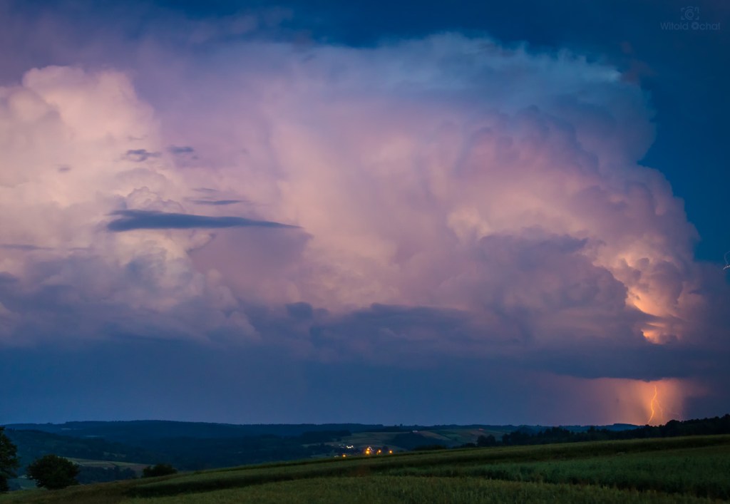 Dodatkowo pojawiły się intensywne promienie zmierzchowe wyłaniające się zza odległej chmury burzowej.