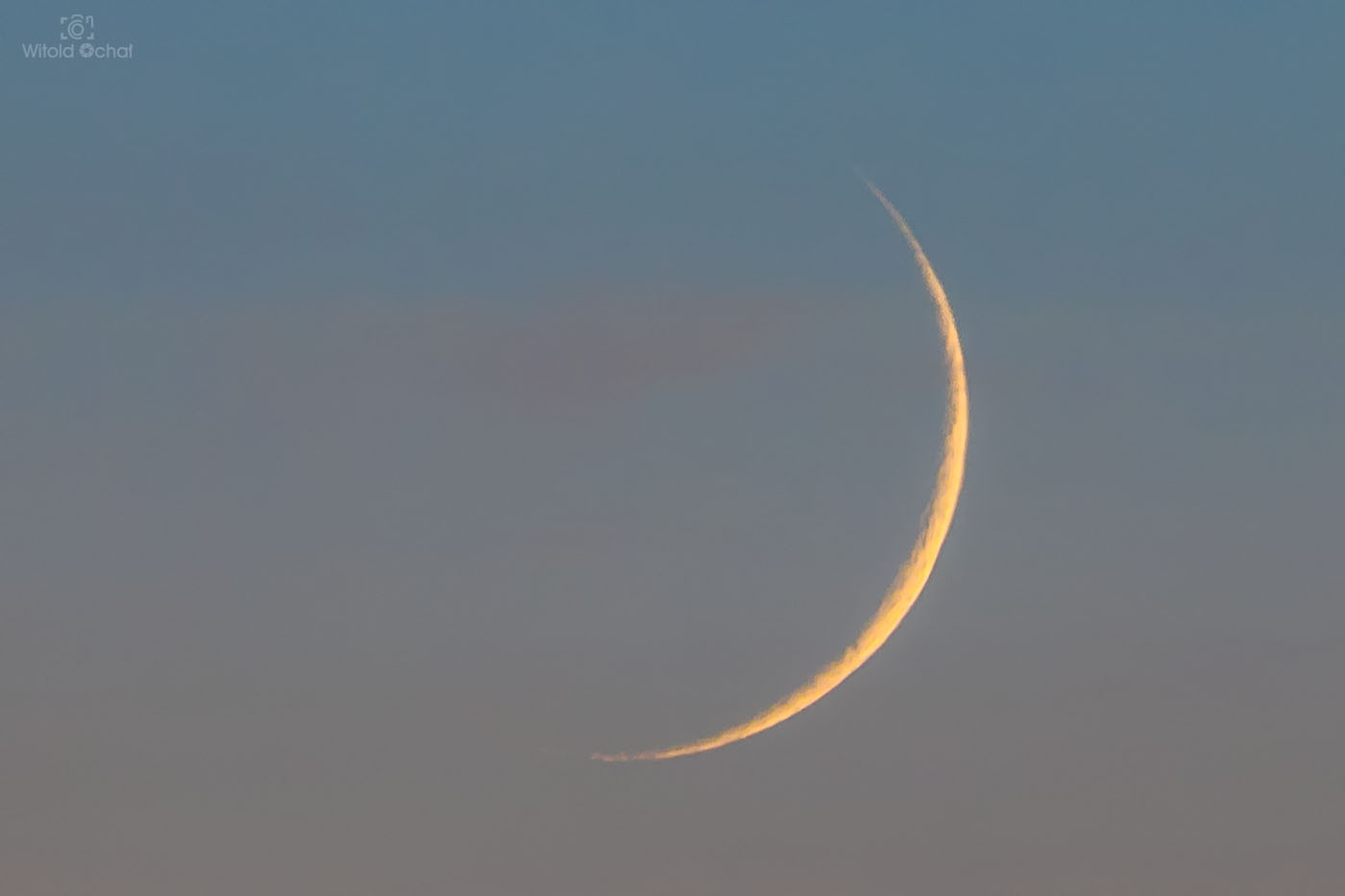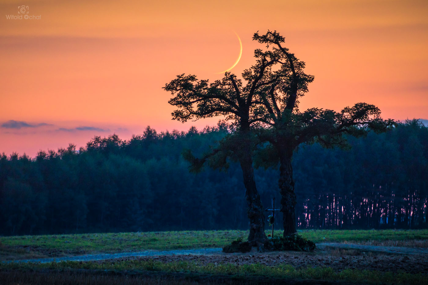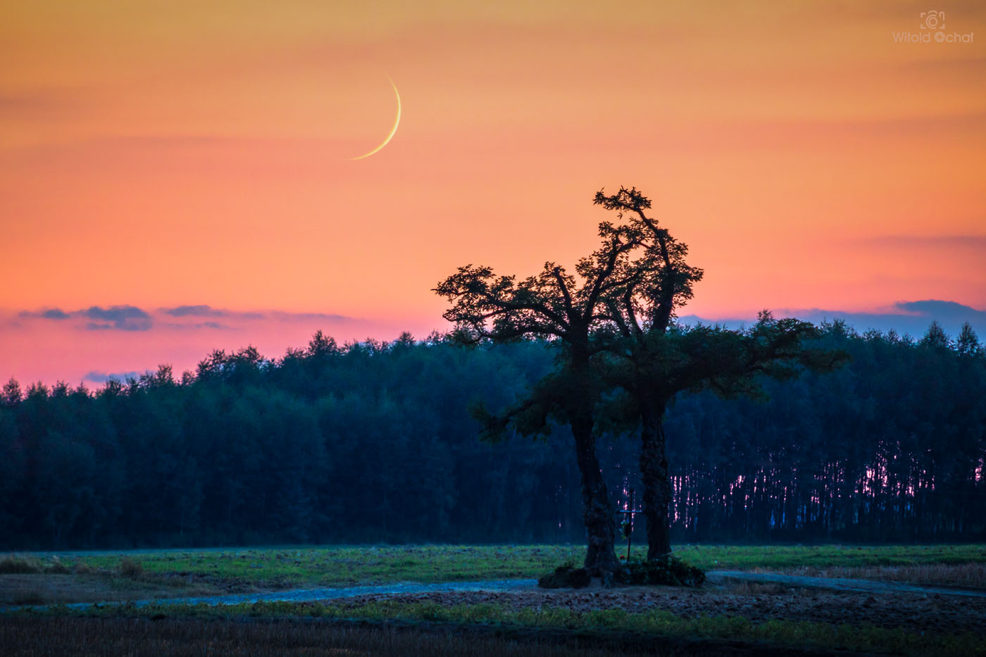 Wczoraj na około godzinkę po zachodzie słońca chylił się również ku zachodowi Księżyc. Widoczność tarczy wynosiła wtedy 3,9%. Był tak cieniutki, że ciężko było go dojrzeć gołym okiem, ale kiedy robiło się coraz ciemniej, stawał się coraz wyraźniejszy. Ja zaczaiłem się na niego kilkaset metrów od dwóch starych akacji. Dzięki odpowiedniej odległości od drzew i użyciu długiej ogniskowej, Księżyc wydaje się okazały.
