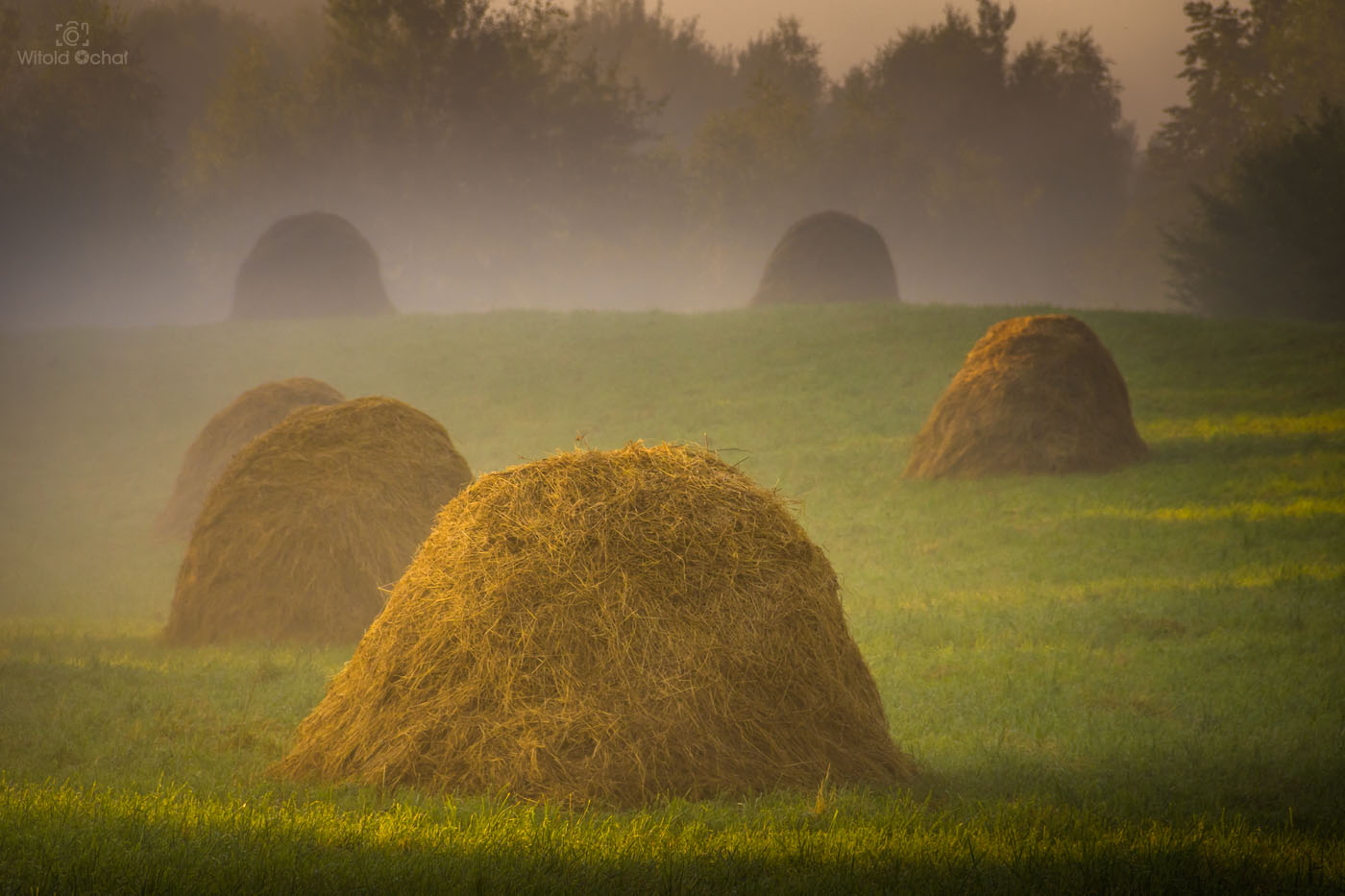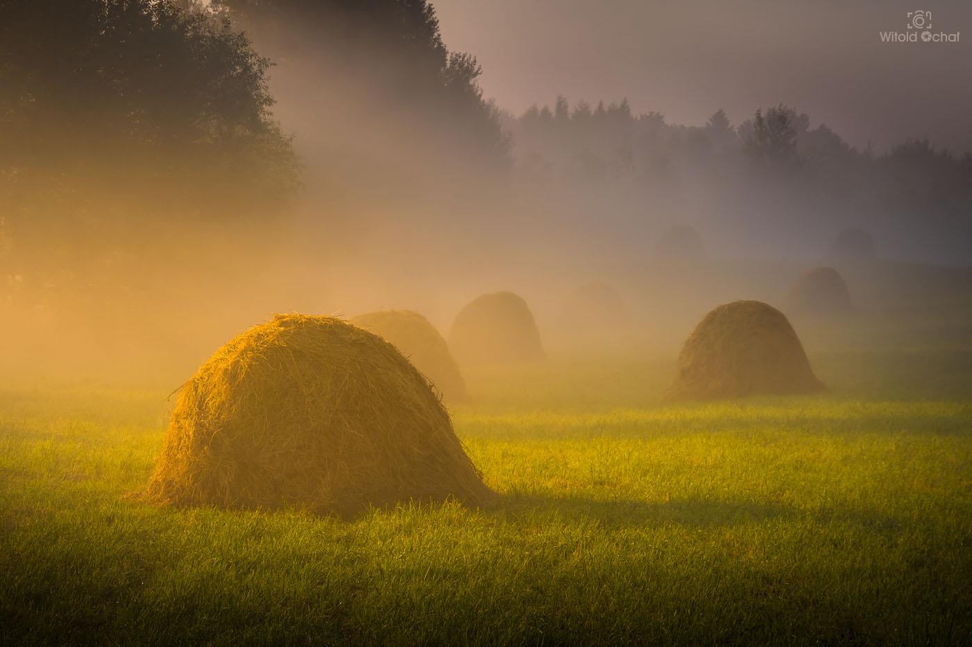 FOT. WITOLD OCHAŁ POWIAT STRZYŻOWSKI FOTOGRAFIA KRAJOBRAZOWA PODKARPACIE GRODZISKO KOPKI SIANA NA ŁĄCE OO PORANKU WE MGLE