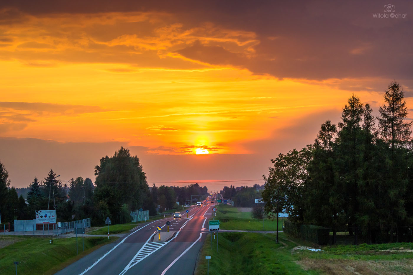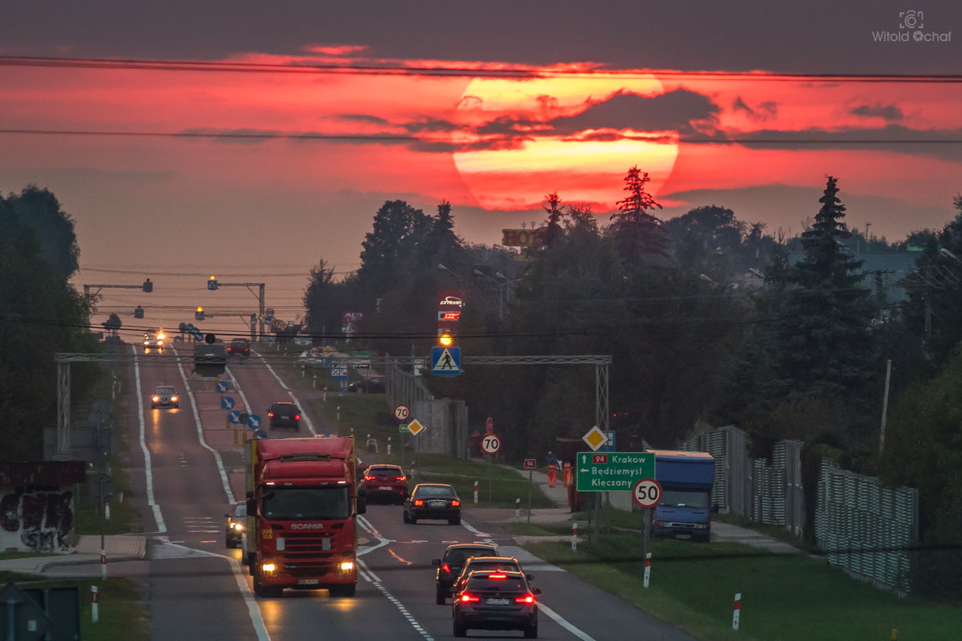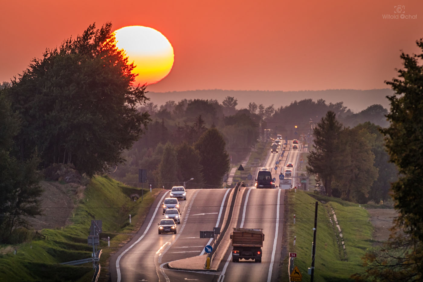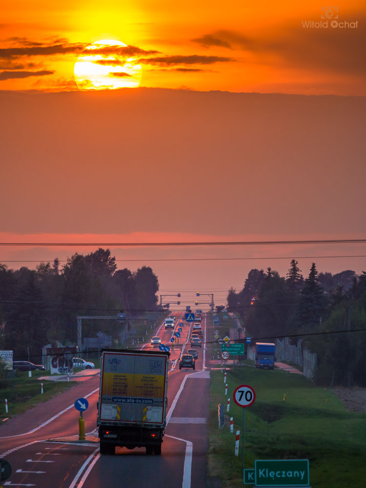 Słońce większe niż ciężarówka? Czemu nie. Wszystko zależy od perspektywy. Zaczaiłem się na wiadukcie kolejowym biegnącym nad drogą (tylko o tym cicho sza, bo nie wiem czy tam wolno) i złapałem zachodzącą kulkę słońca nad długim prostym odcinkiem drogi. Przyznacie, że robi wrażenie 😉