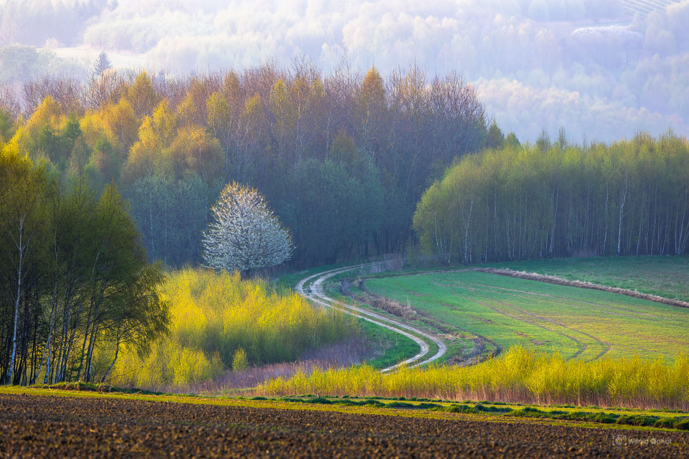 Wtedy jeśli tylko mogę zatrzymuję się i wrzucam wsteczny. Lub jak sie nie da, to zawracam. Tak też było tym razem. Wyjechałem zza zakrętu i rzuciło mi się w oczy to pięknie oświetlone wieczornym słońcem kwitnące drzewo. Zwykły, popularny widok, jakich teraz sporo na wsi, a jednak ten kadr ujął mnie szczególnie.