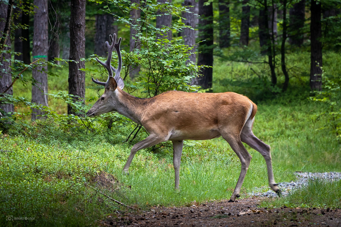 To zapewne zwykły zbieg okoliczności, ale kilka kilometrów później taki własnie jeleń wyszedł mi na drogę kilkadziesiąt metrów przede mną. Najpierw spacerkiem, bez pośpiechu, nie miał pojęcia o mojej obecności. Potem zatrzymał się i spojrzał w moją stronę. Zrobiłem fotkę i chwilę patrzyliśmy na siebie, po czym pocwałował w ostępy leśne. Dopiero wtedy nabrałem powietrza w płuca, bo przypomniało mi się, że przez te kilkadziesiąt sekund w ogóle nie oddychałem 😉