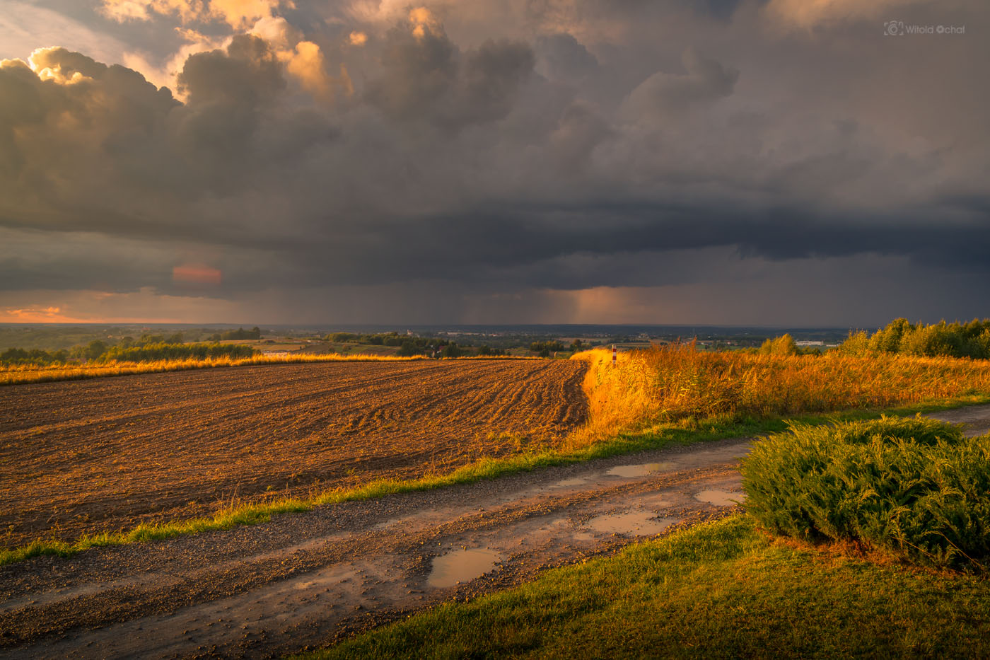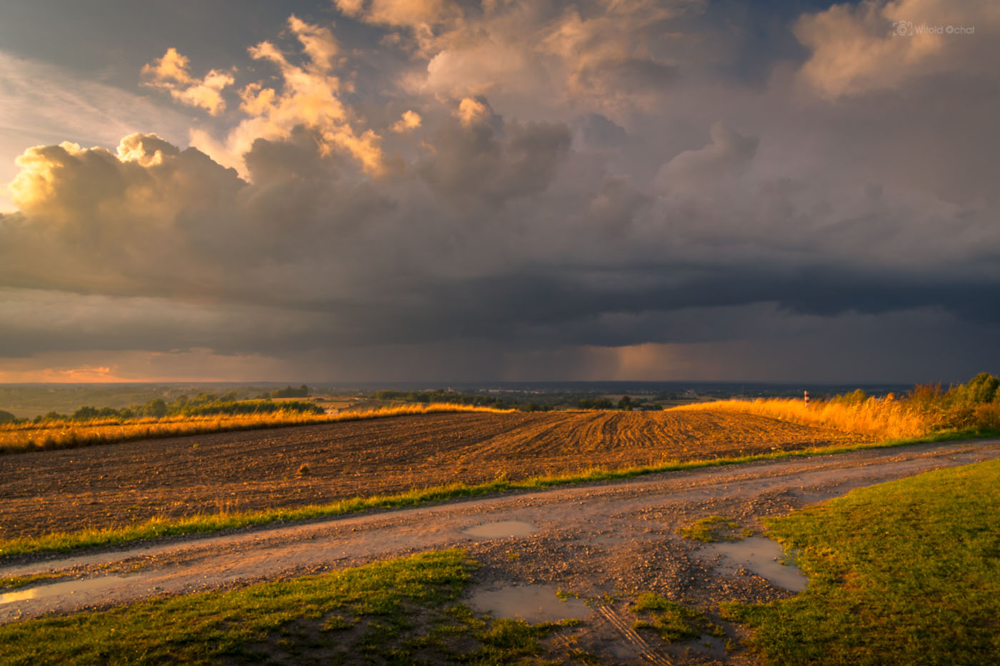 Wracam dziś do przedwczorajszego wieczoru, kiedy nad moją okolicę nadciągał widowiskowy wał szkwałowy (wczorajszy wpis). Trzy fotki. Tyle udało mi się zrobić od czasu kiedy wpadłem na wzgórze, a zanim zaszło słońce. To było króciótkie trzy, może pięć minut. W tym czasie zdążyłem porzucić auto, szybo rozłożyć statyw, zapiąć aparat i zrobić wspomniane trzy ujęcia.