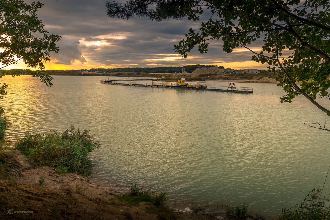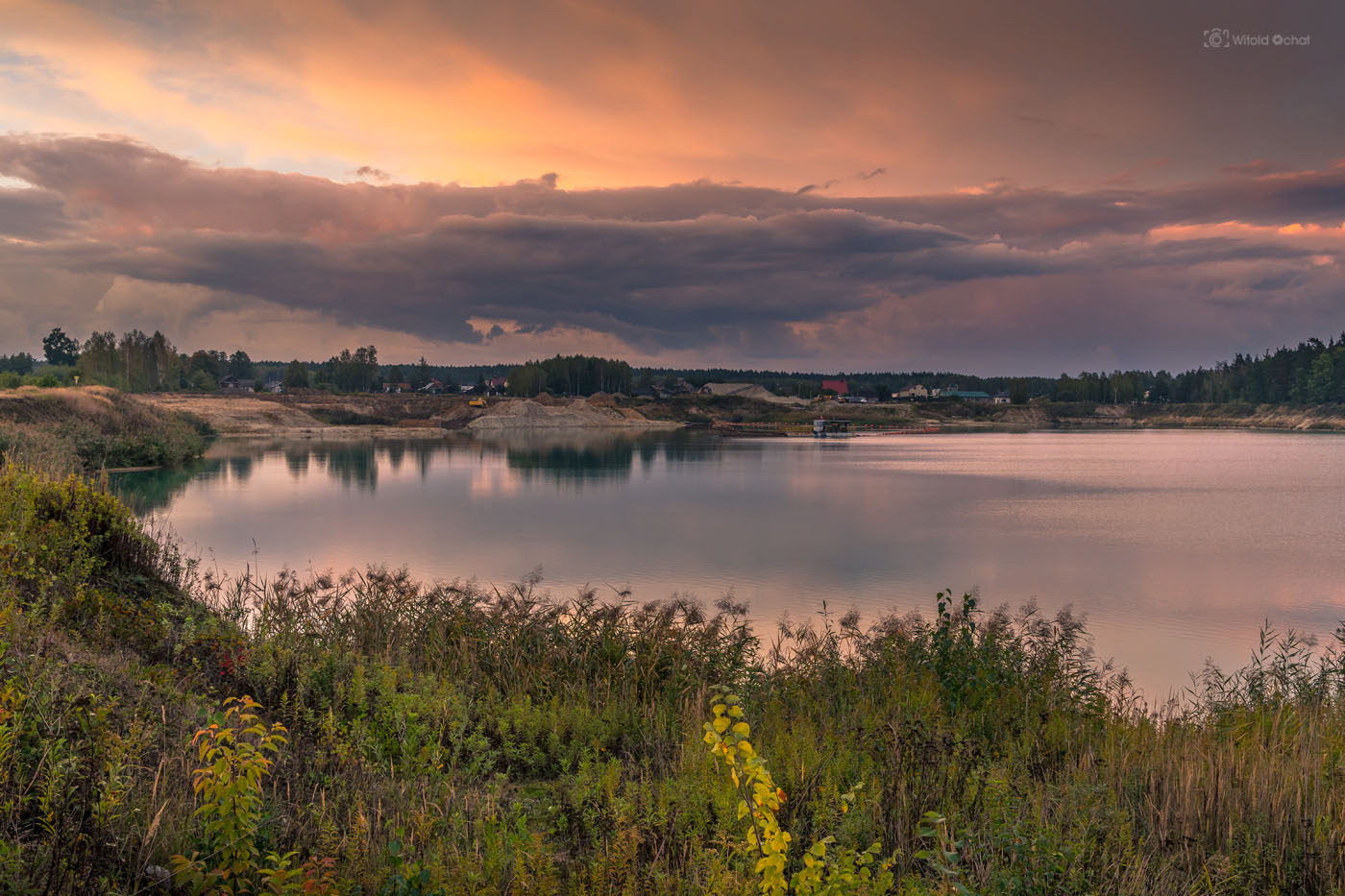 Zacumowałem nad żwirownią. Postanowiłem poczekać, a nuż ciemna chmura się odsunie i nastanie światłość. Nie chciałem marnować czasu, więc przechadzałem się w poszukiwaniu kadrów. I to chyba był dobry pomysł, bo łądniej już nie było. No może już po zachodzie, gdy na kilka chwil królowały fiolety.