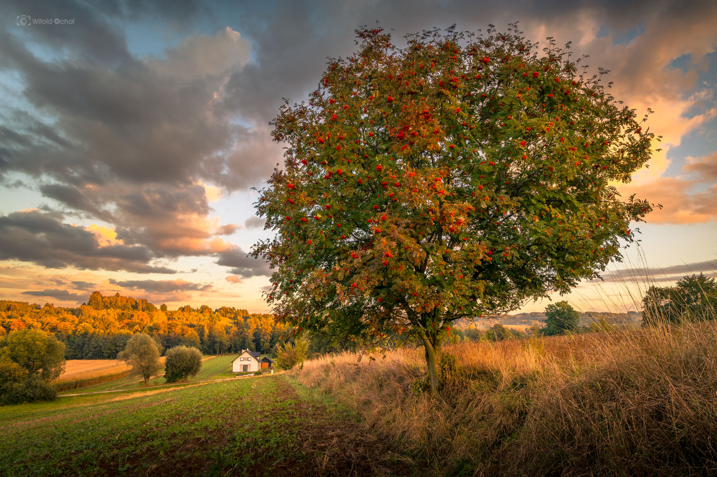 Wydawało mi się, że najciekawsze miejscówki blisko domu znam jak własną kieszeń. Jednak o tym drzewku jarzębiny nie wiedziałem, mimo że przejeżdżam codziennie kilkadziesiąt metrów od niego. No ale nie widać go z drogi, albo z tej odległości i pod tym kątem nie wygląda atrakcyjnie.