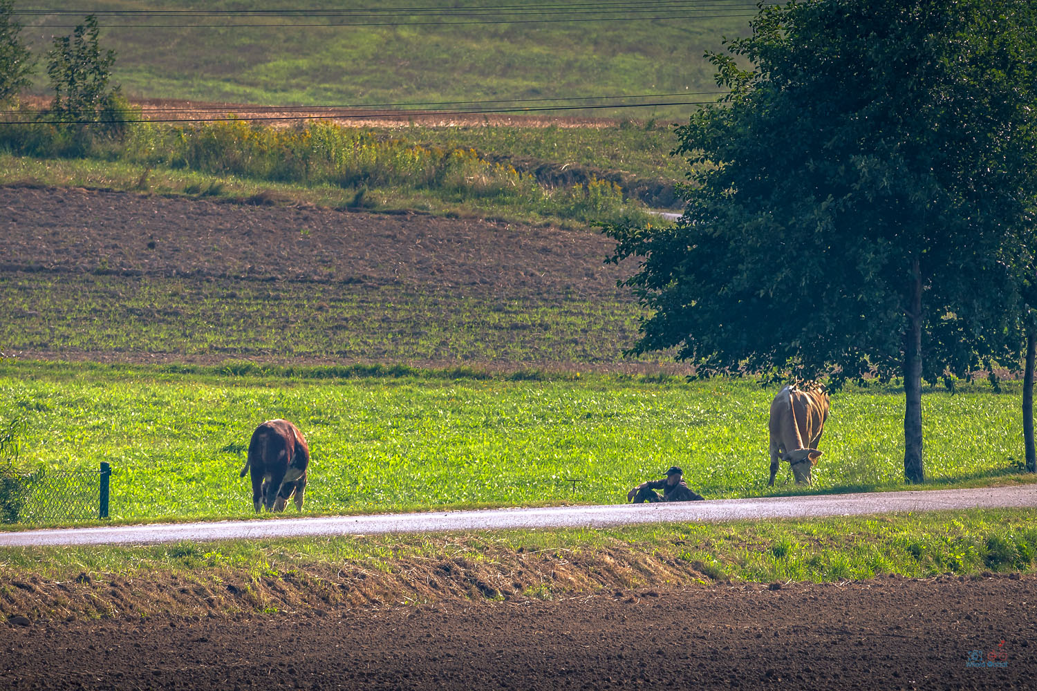 Myślę, że bardziej sielskiego obrazka już dziś nie zobaczycie. Miły starszy pan pasący krowy. Kiedy zobaczyłem ten widok, musiałem to uwiecznić, bo przypominało mi to żywo moje czasy młodości, kiedy normalne było pasanie krów 😉