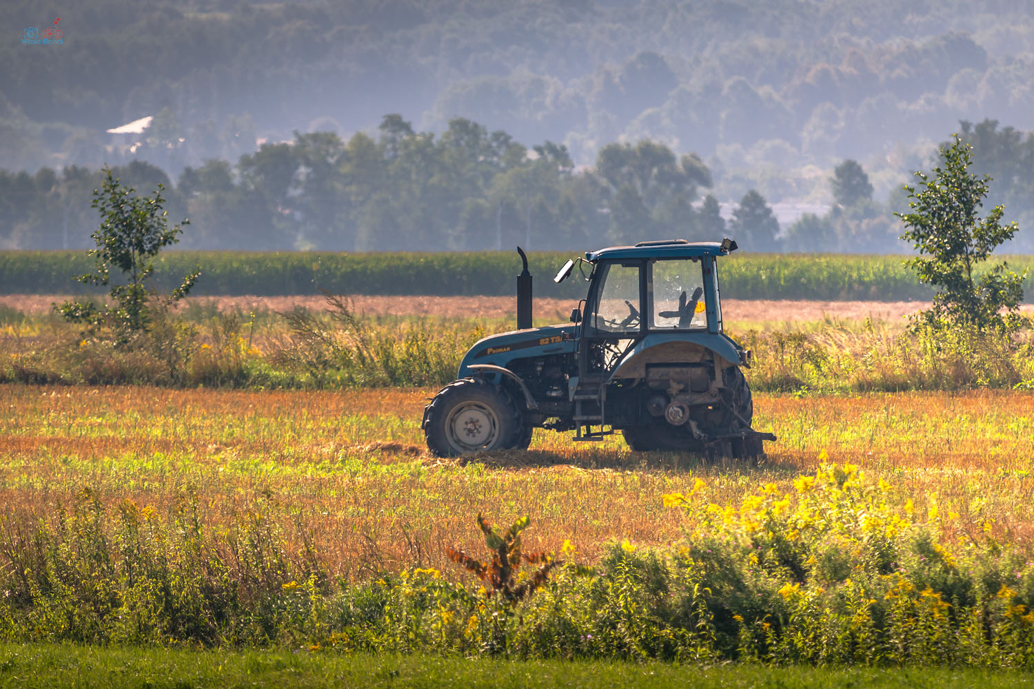 Zepsuty traktor w środku pół z dala od zabudowań? Ano bywa i tak. Bez koła czekał sobie spokojnie na mechaników.