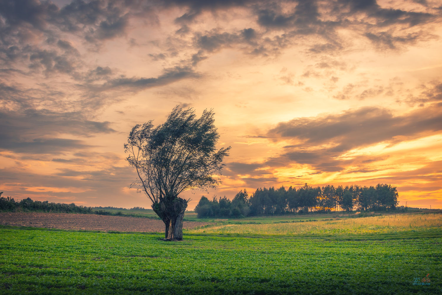 Nie zawiodłem się, a kolor utrzymywały się na niebie bardzo długo. Udało się też obejść kilka miejscówek, jednak ta chyba najbardziej przypadła mi do gustu. Poniższą wierzbę pokazywałem już tutaj. Ogłowioną, potem elegancko odrośniętą, a teraz jak widzę dopadł ją ogień, całkiem możliwe, że przyczyną był piorun, na co wskazują odłamane kawałki pnia.