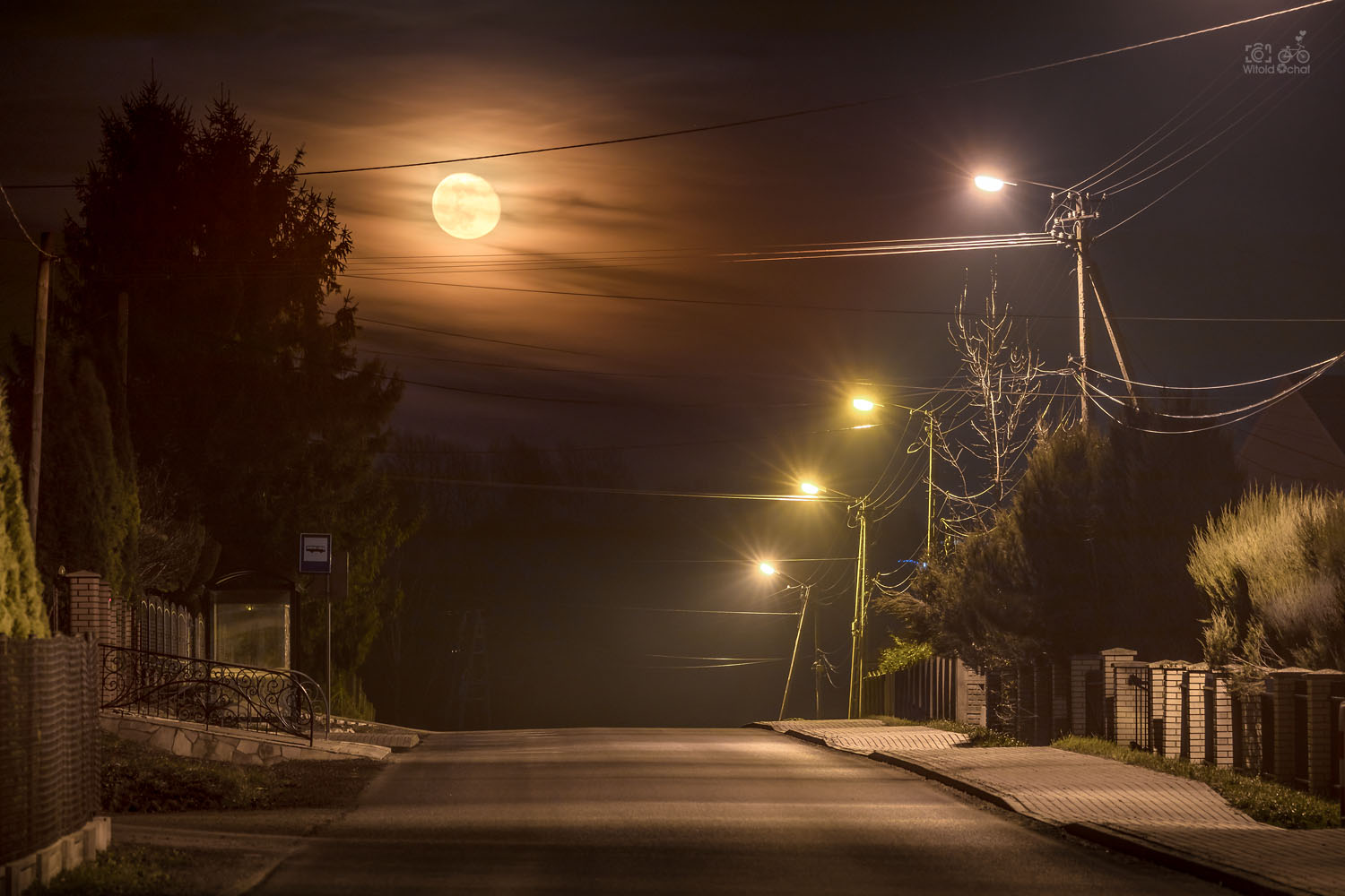 W zimie ciężko o bezchmurne niebo, i zazwyczaj jestem w pracy, gdy można fotografować wschodzący czy zachodzący Księżyc w pełni. Wczoraj nadażyła się okazja. Malejący już nasz naturalny satelita, wczoraj o 18:30 zawisł na wysokości 5° nad moją ulicą. Wystarczyło pobrać z domu aparat, statyw, wyjść na podjazd i pstryknąć fotkę.