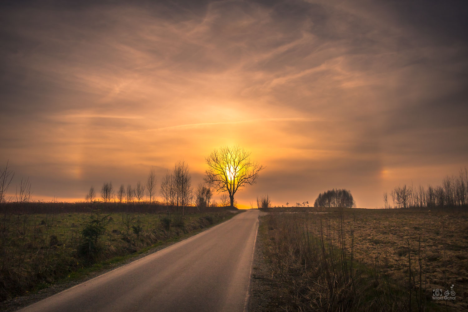 Nie wiem o co chodzi, ale to drzewo, podobnie jak akacje przyciąga chyba waruny. Kolejny raz w tym miejscu trafiłem na fajny zachód słońca. Zachód ze słońcami pobocznymi i subtelnym halo słonecznym.