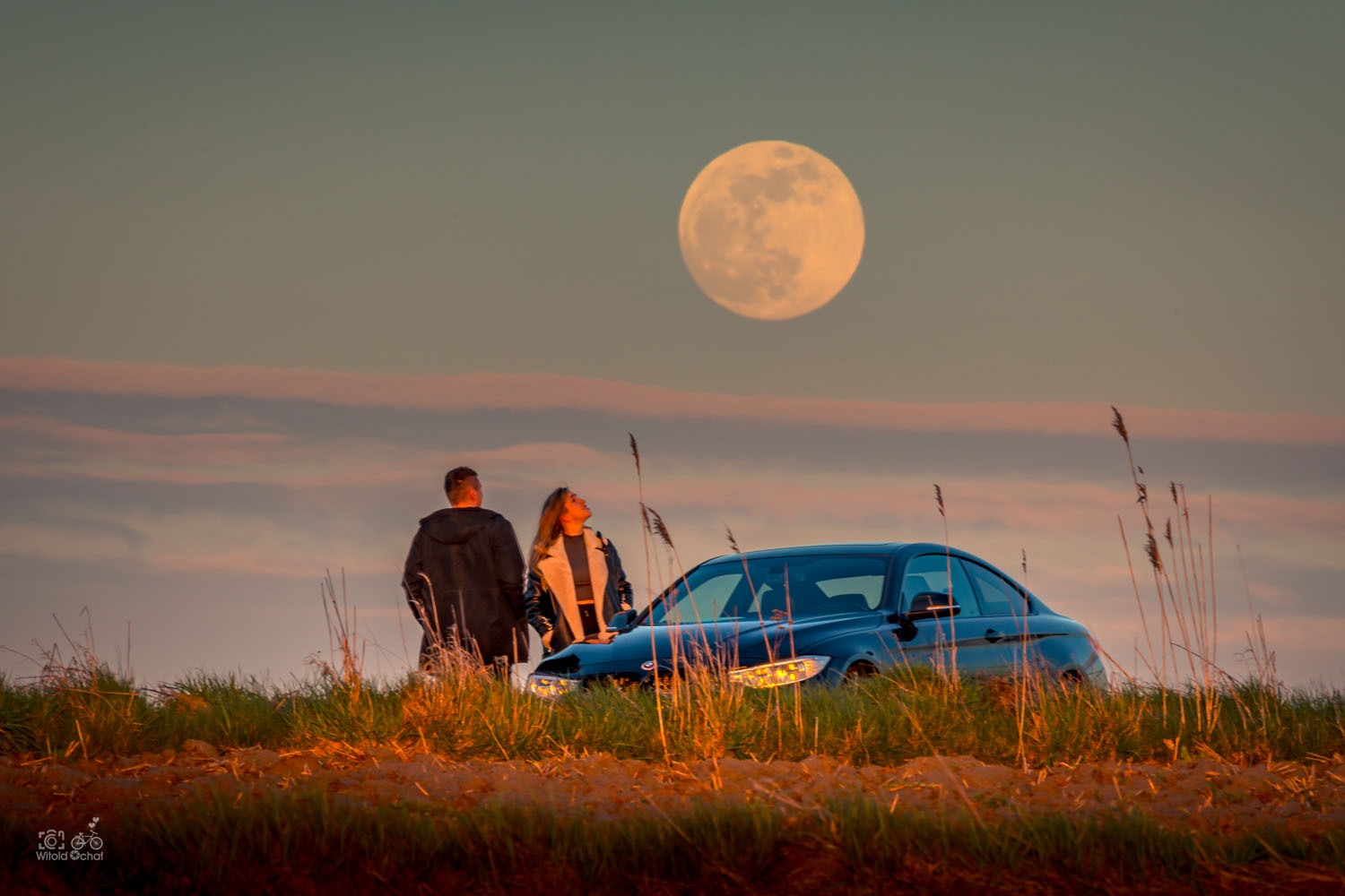 Jednak stały tam samochody i postanowiłem je wykorzystać, a z jednego z nich wyszła para (pozdrawiam, jeśli to czytacie) i chyba zauważyli mnie daleko w polu, fotografującego w odwrotną stronę, niż trwający właśnie zachód słońca. Oglądnęli się, a ja w tym momencie wcisnąłem w aparacie guziczek 😉