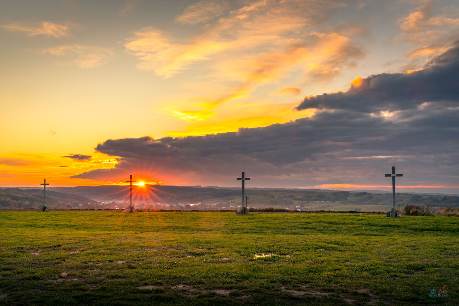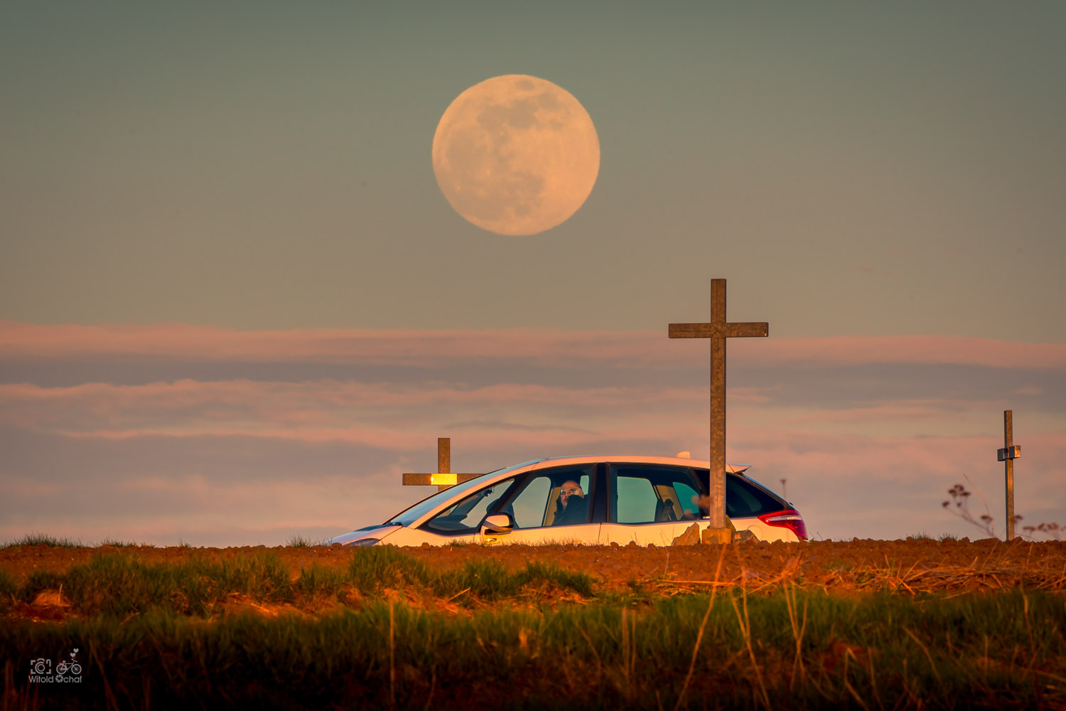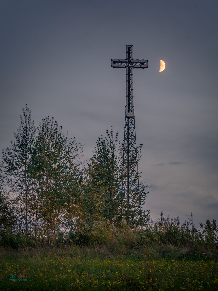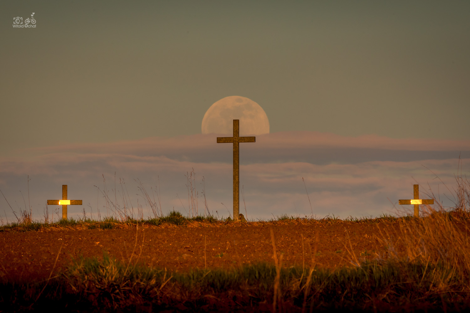 Sporo chmur wisiało nad wschodnim horyzontem. Mimo to zająłem miejsce i czekałem. W panie było sfotografowanie naszego naturalnego satelity za krzyżami Drogi Krzyżowej z odpowiedniej odległości, aby uzyskać efekt dużego Księżyca.
