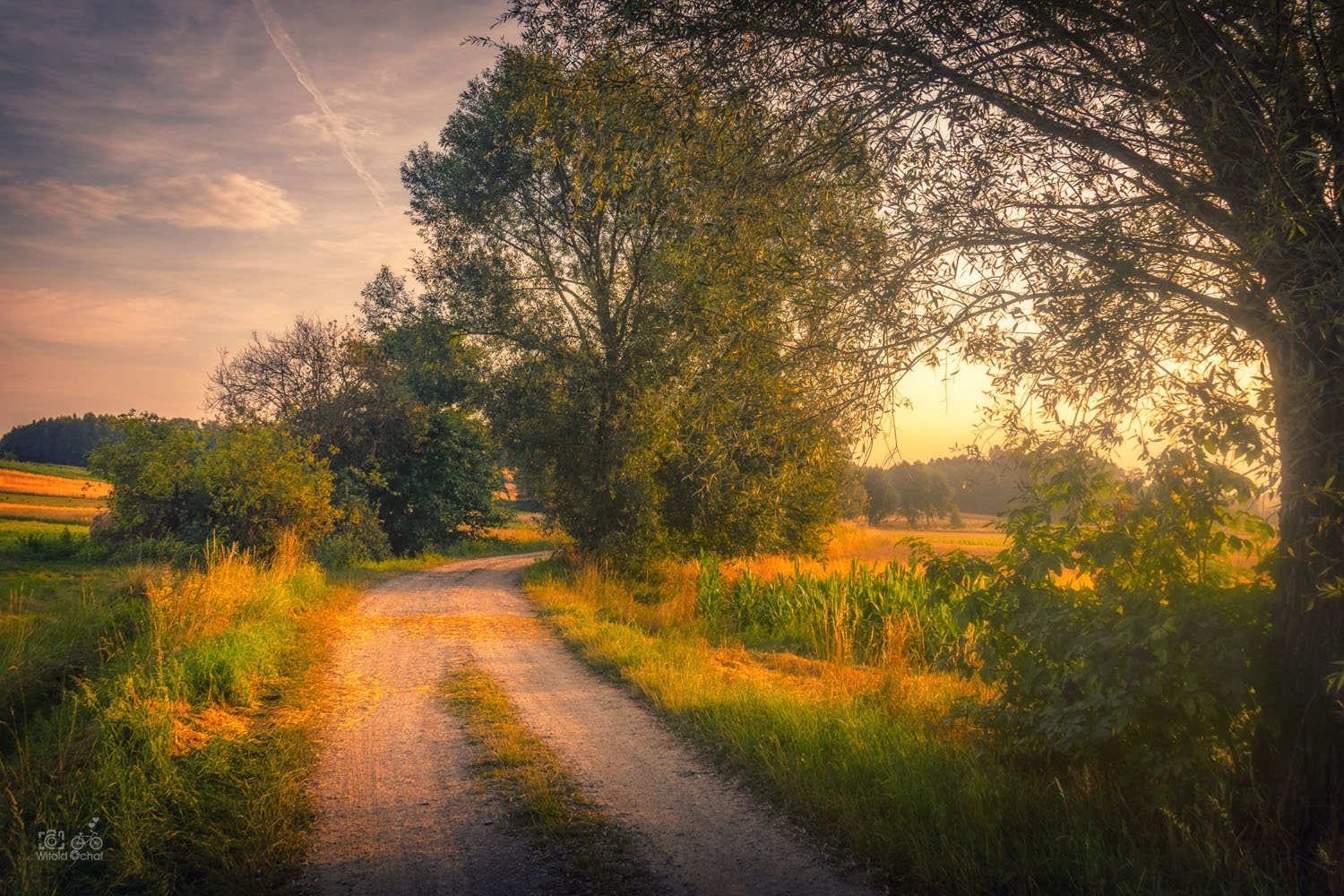 Było już godzinę po wschodzie, ale słońce dopiero co wyszło zza chmur wiszących nad horyzontem. Na dzień dobry odbiłem na wijącą się zakrętami polną drogę, która w tym świetle wyglądała wyjątkowo malowniczo.