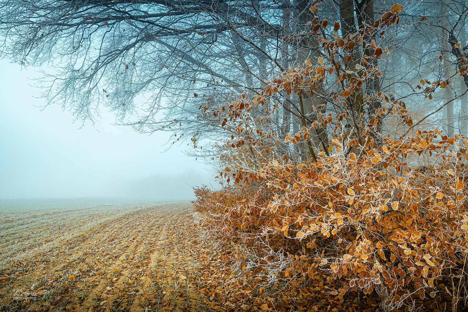 Zatrzymałem się na skraju bukowego zagajnika. Poranek był mglisty i mroźny. Zafascynowały mnie te wszechogarniające rudości opadniętych liści i… kontrastująca zieleń paprotek.