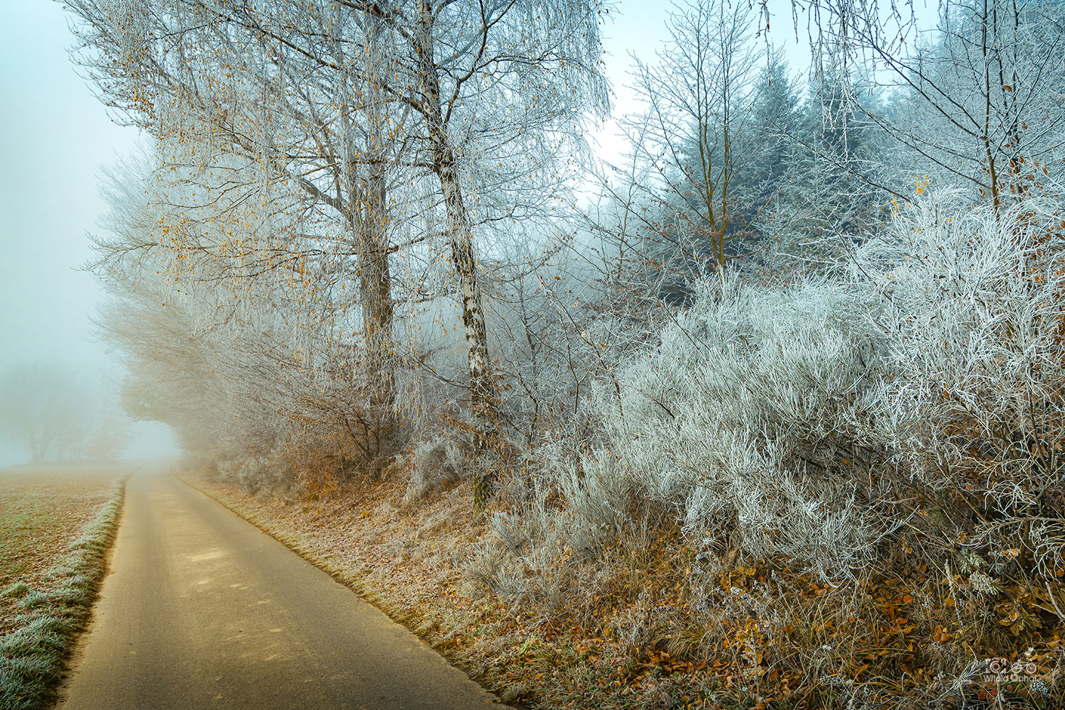 Mgła i przymrozek. Po takiej nocy nie może być inaczej. Muszą być takie piękne szadziowe widoki. Nie inaczej było w poniedziałkowy poranek. Szczęście, że akurat w dzień wolny od pracy. Można było poranek spędzić w tych cudnych okolicznościach przyrody.